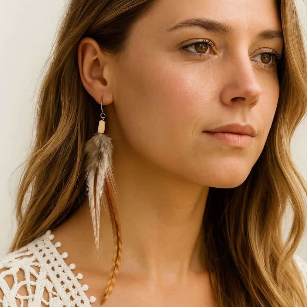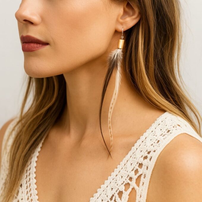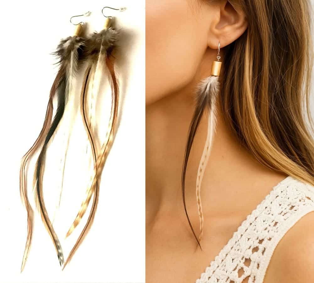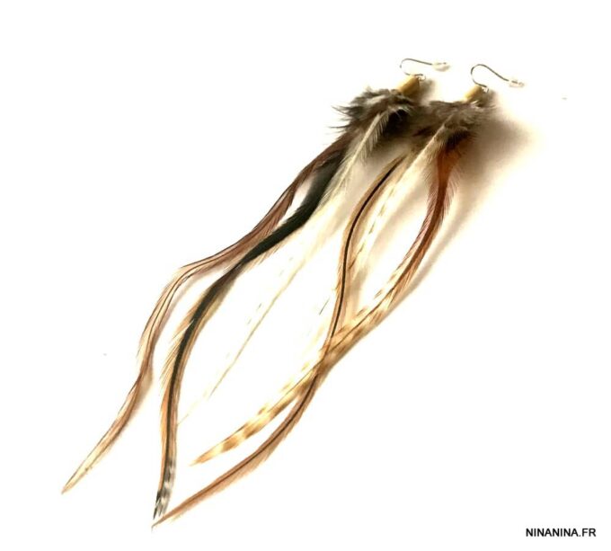 Un look apache, de longues plumes aussi fines et délicates que tendances, portées avec la bonne tenue, et dans les bonnes circonstances, Ces boucles d’oreilles en plumes originales ne manqueront pas leur effet, c’est certain! Si vous aimez les bijoux en plumes, vous ne pourrez qu’être séduite !