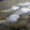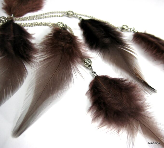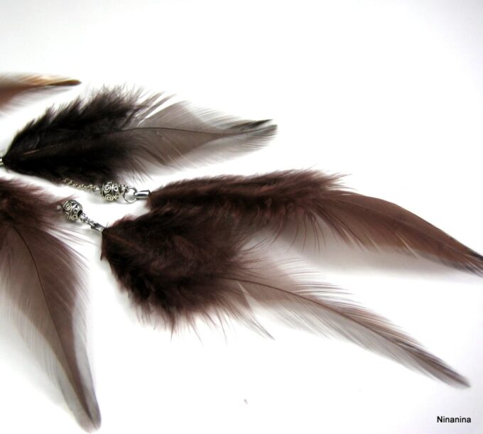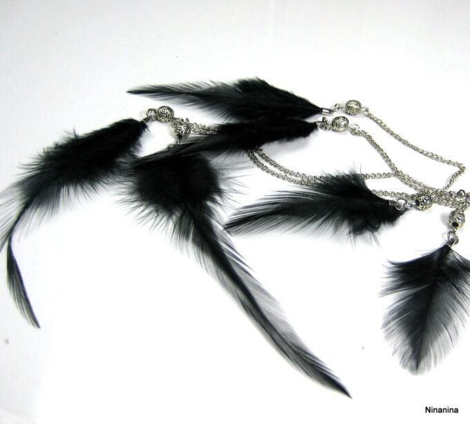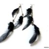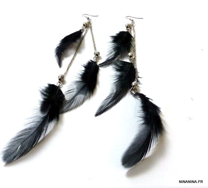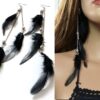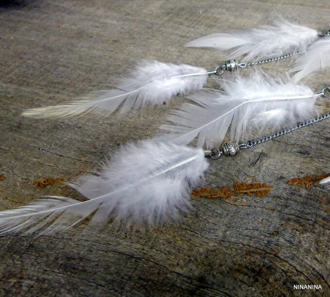 Boucles d’oreilles plumes longues blanches chaine acier constituées de plumes blanches et de perles de métal ciselées argentées montées sur chainette et boucles pendantes en acier inoxydable.