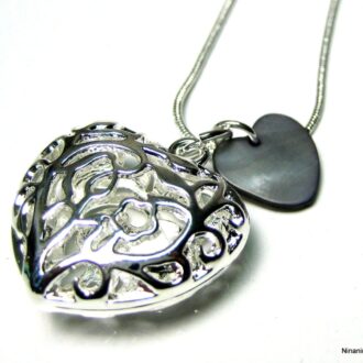 Boucles d’oreilles plaqué argent composées d’un pendentif coeur filigrané en plaqué argent monté sur boucle pendante. Dim du pendentif : 1,6 X 1,6 cm environ. Longueur totale (boucle comprise) : 3 cm. Livrées avec embouts stoppeurs en silicone. Poids : 3,9 g. Livré dans sa pochette d’organza.