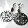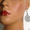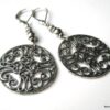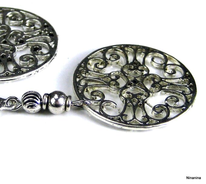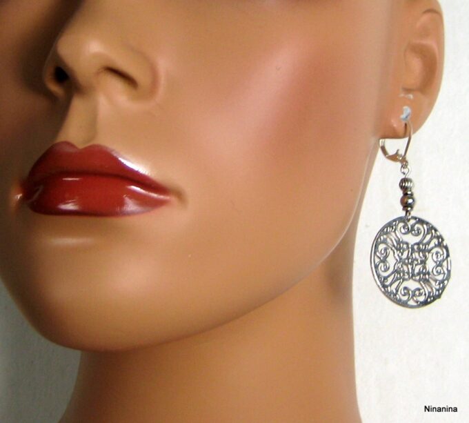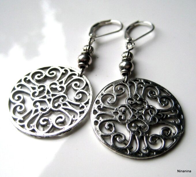 Boucles d’oreilles fantaisie composées de 2 rosaces rondes ajourées et de deux petites perles en métal argenté montées sur boucles dormeuses en métal argenté. Diamètre de la rosace : 2,8 cm. Longueur (boucle comprise) : 6 cm environ. Livrées dans sa pochette d’organza. Bijou 100% fait-main.