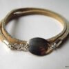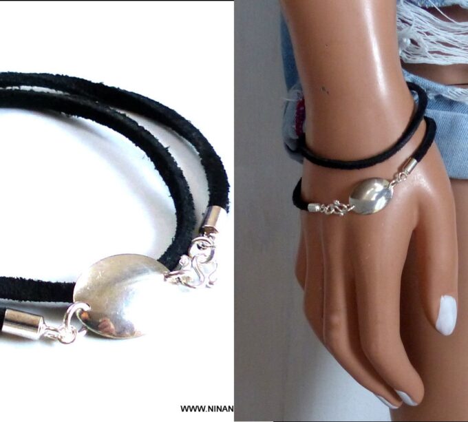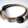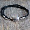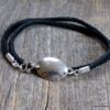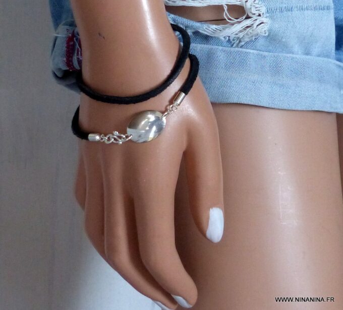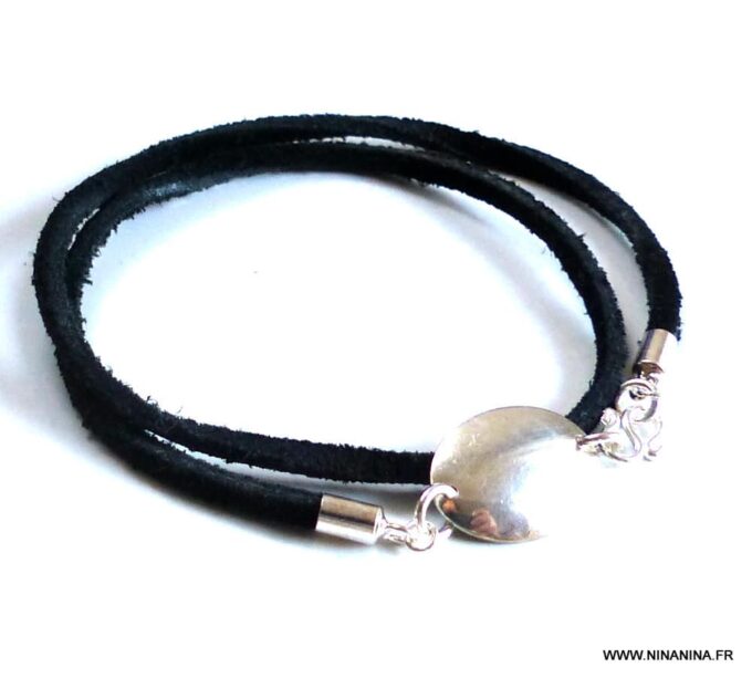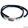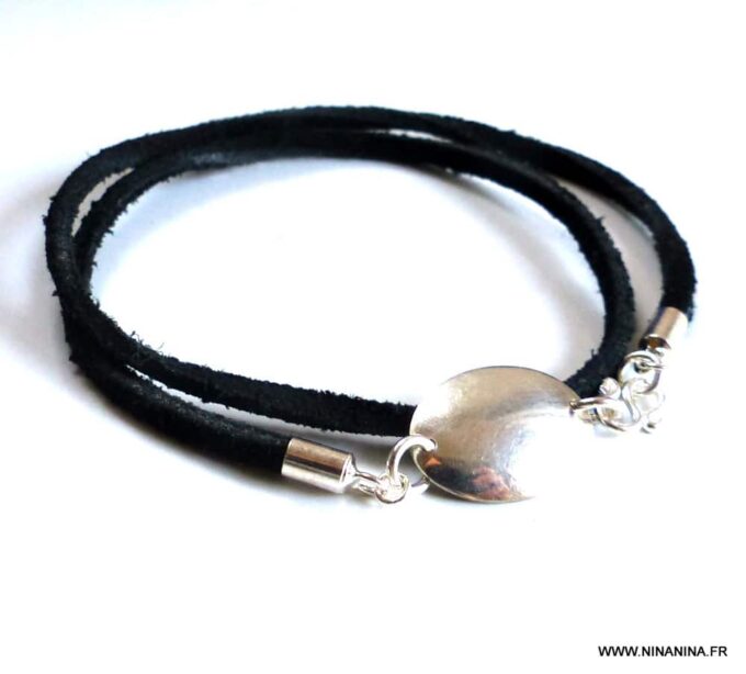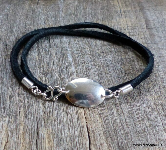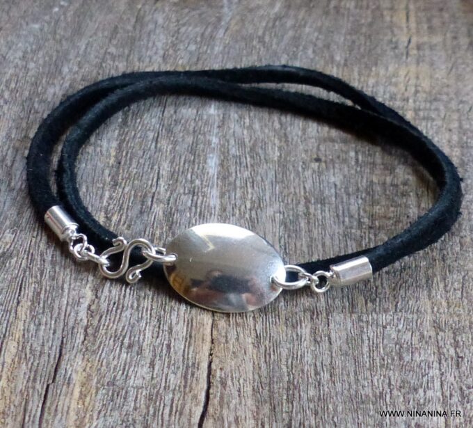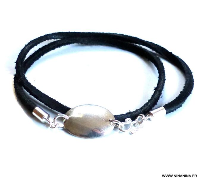 Bracelet double tour femme Argent 925 Cordon Cuir composé d’une plaque ovale bombée en argent 925 montée sur lien de daim (largeur : 3 mm) à enrouler autour du poignet.