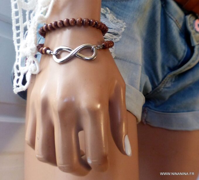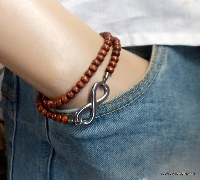 Faites un cadeau romantique avec ce magnifique Bracelet Infini Acier inoxydable et perle bois composé d’une plaque représentant le noeud infini en Acier inoxydable argenté montée sur un double rang de perles de bois marron clair de 6 mm de diamètre montées sur un fil elastique. Tout un symbole pour un bijou sobre, raffiné et élégant, à enrouler autour du poignet (2 tours).