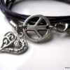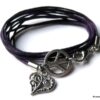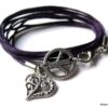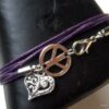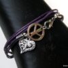 Bracelet 3 tours composé d’une médaille peace et d’un petit coeur en métal argenté montés sur un triple cordon de coton ciré violet (1mm de diamètre). Existe en noir, marron chocolat, blanc cassé, rouge, bleu nuit, violet, turquoise, rose clair, rose foncé et gris. Longueur totale (fermoir compris) : 56 cm env. Fermoir mousqueton. Livré dans sa pochette d’organza. Bijou 100% fait-main.