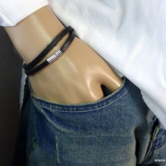 Bracelet homme cuir 3 tours fermoir acier inoxydable? composé d’un lacet de cuir (5 mm de large) terminé par un fermoir cylindrique en acier inoxydable.