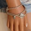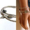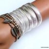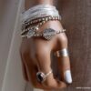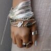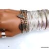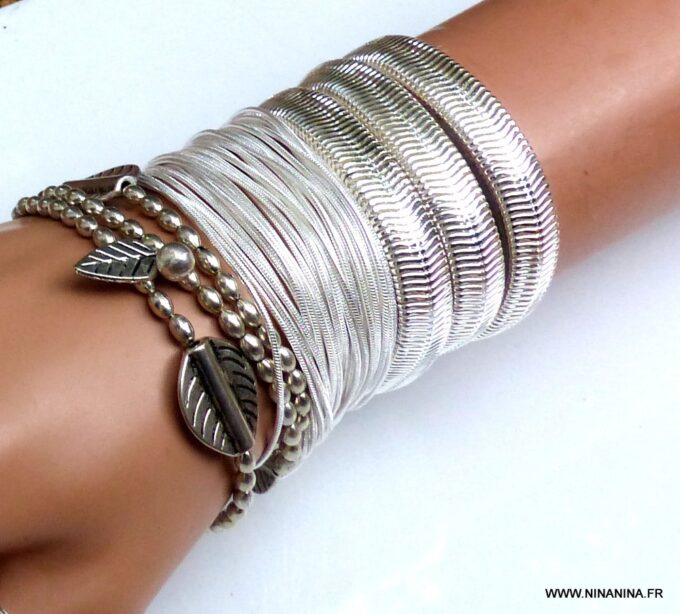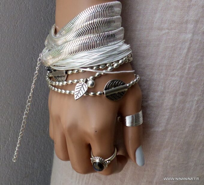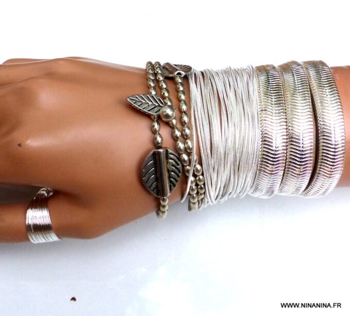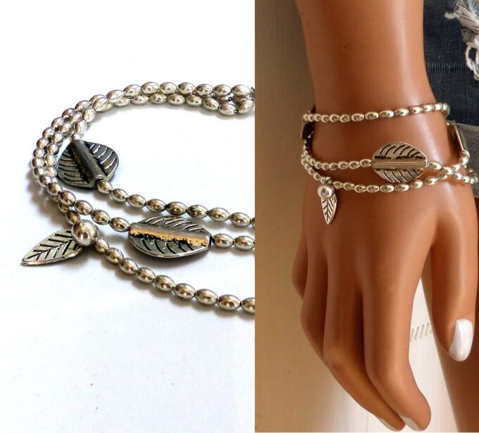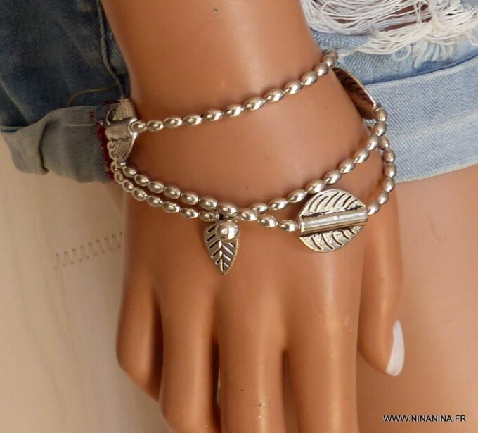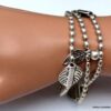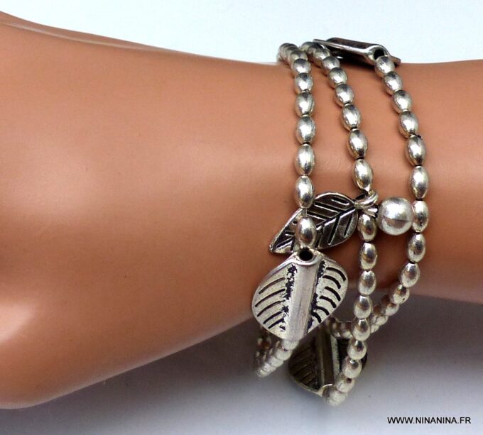 Bracelet boheme 3 tours perles métal argenté composé de 3 rangs perles cylindriques et de breloques en métal argenté montées sur un fil très solide.