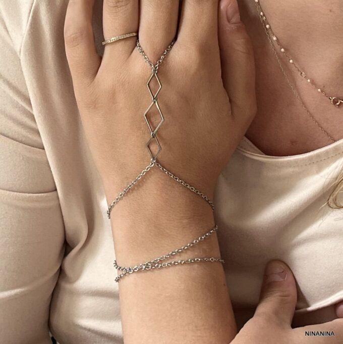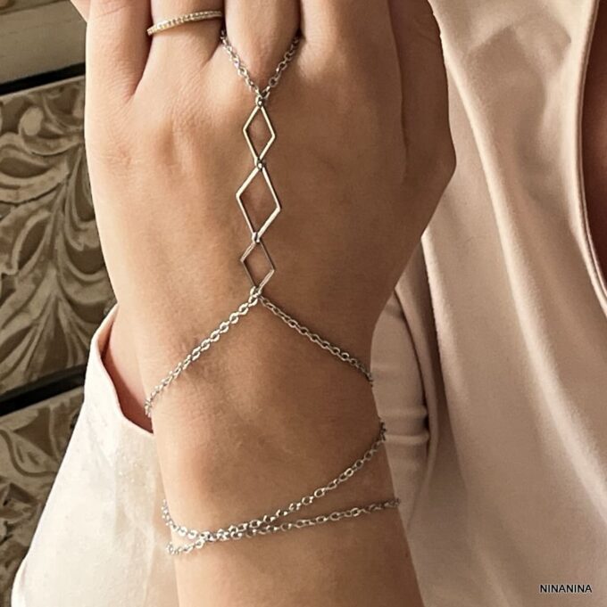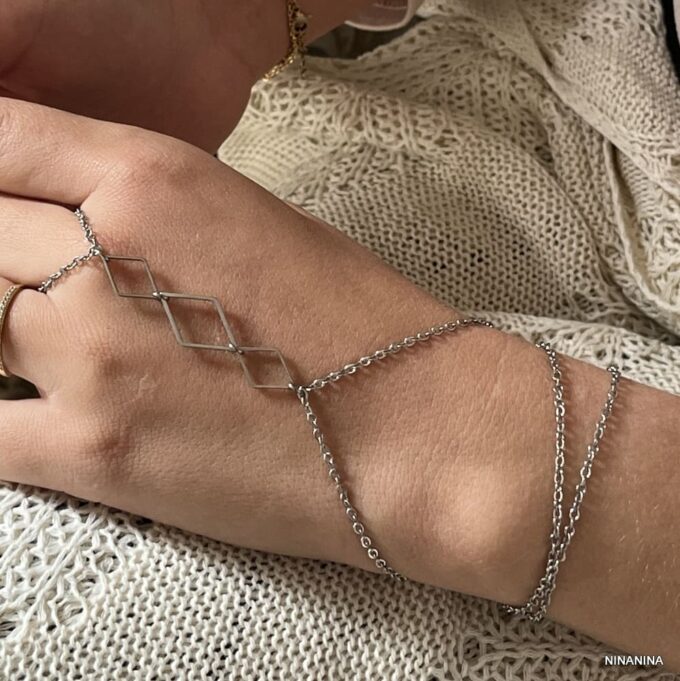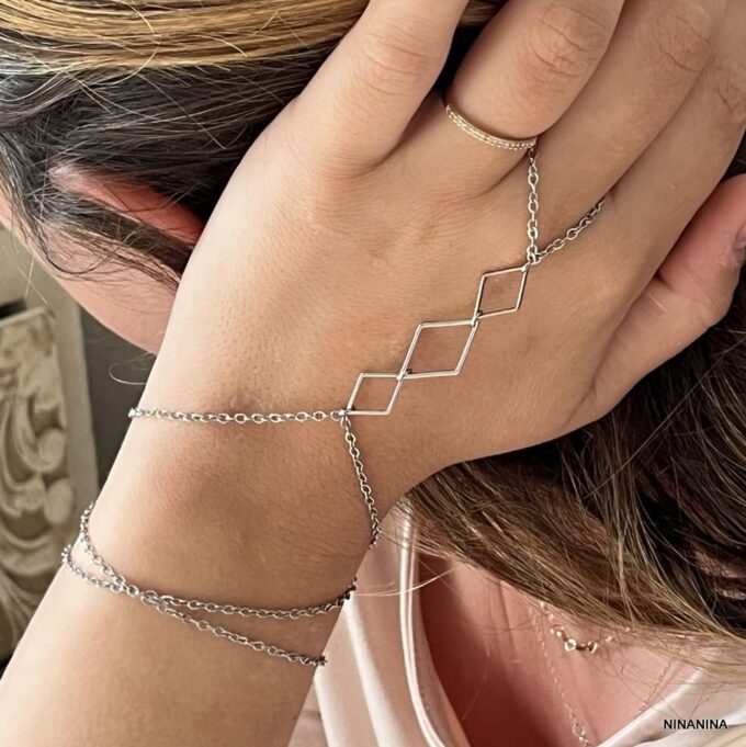 Exprimez votre personnalité avec ce bracelet a bague géométrique fait main, alliant trois rangs chaînes fines à une structure centrale formée de losanges élégants en acier inoxydable. Pensé pour habiller à la fois le poignet, la main et le doigt, ce Bracelet Bague crée une ligne architecturale qui attire l’œil sans surcharge.