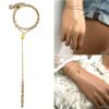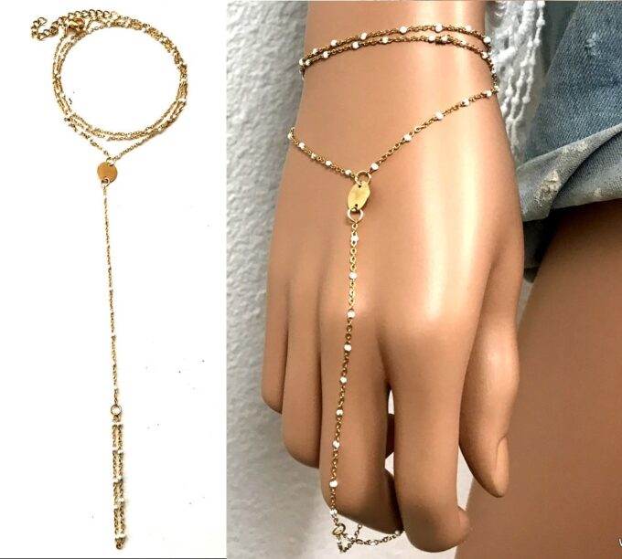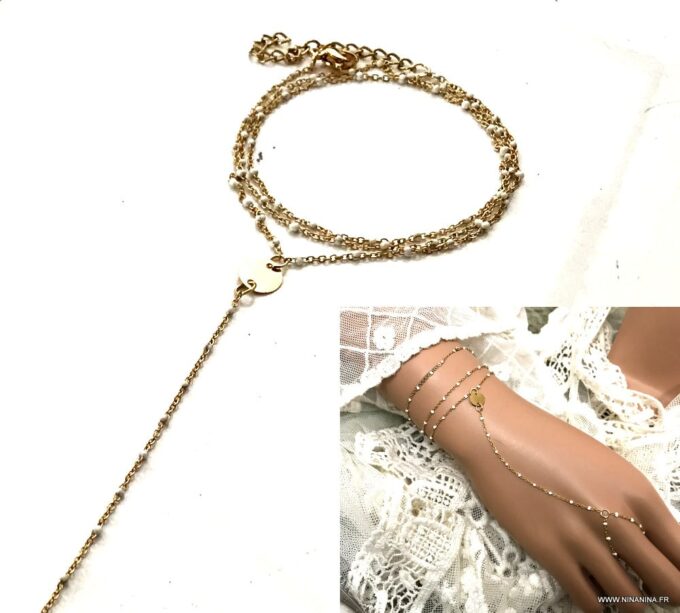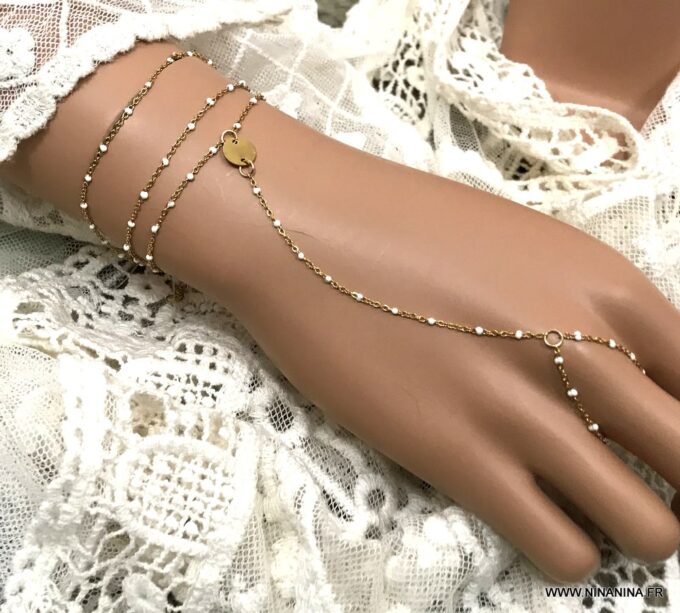 Délicat et raffiné, ce Bracelet a doigt avec bague perle blanche acier inoxydable doré composé de mini perles blanches émaillées réparties sur une fine chaine en acier inoxydable plaqué or, formant un bracelet relié à une chainette formant la bague, délivre toute sa finesse, et vous fera tout simplement craquer!
