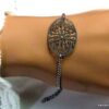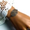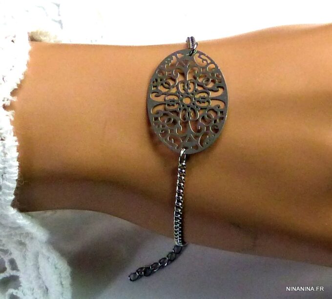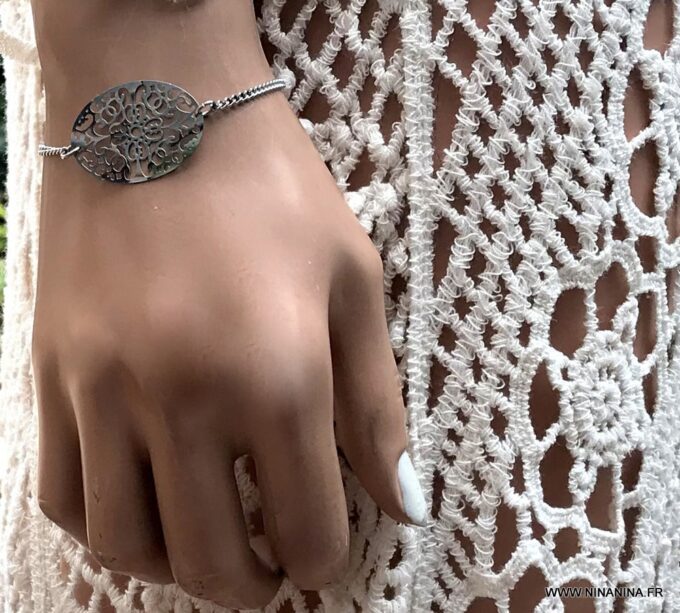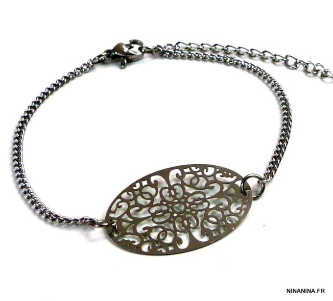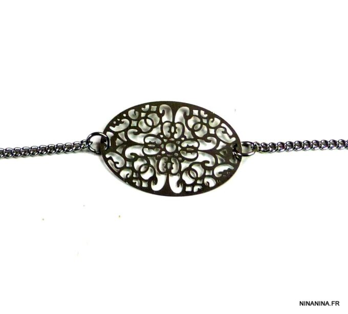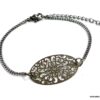 Bracelet Acier femme plaque ovale filigranée composé d’une plaque ovale filigranée en acier inoxydable argent montée sur une chainette en acier inoxydable.