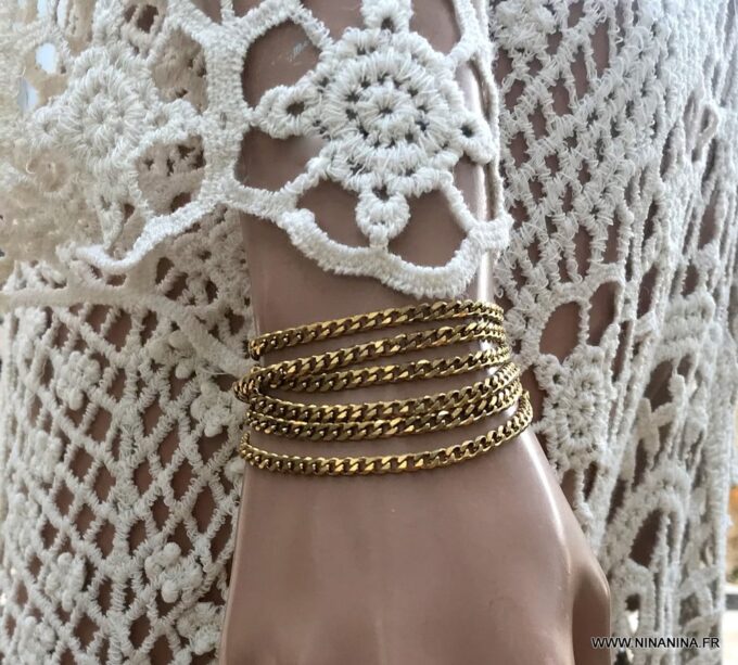 Ce Bracelet a plusieurs tours acier inoxydable doré femme couvre votre poignet de la manière la plus jolie qu’il soit ! Une belle couleur dorée, une maille gourmette de 3mm de large, il ne lui en faut pas plus à ce bijou de main en acier chirurgical pour faire des jaloux !