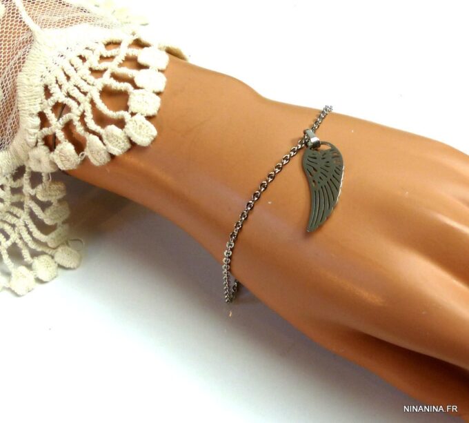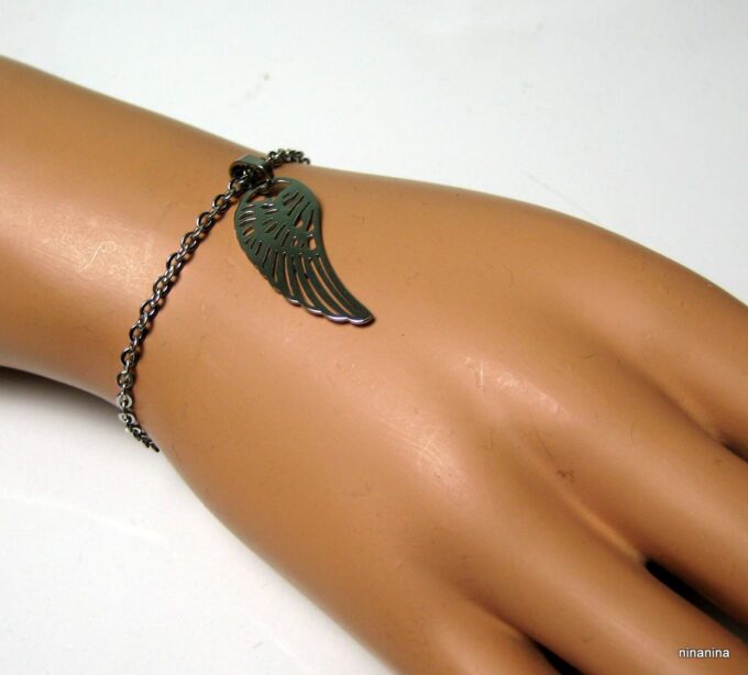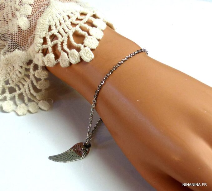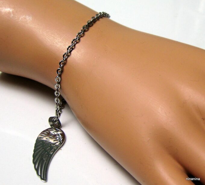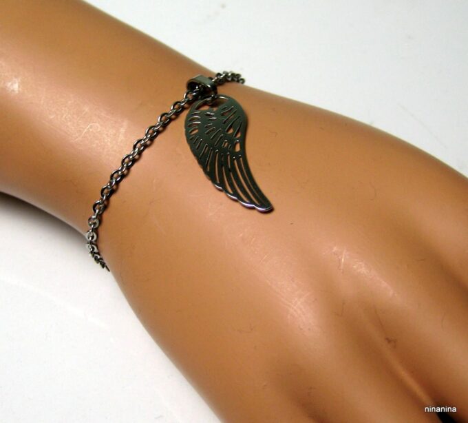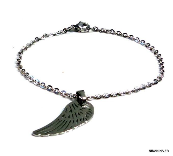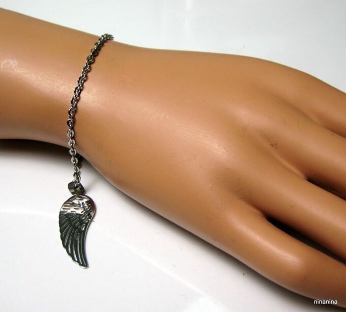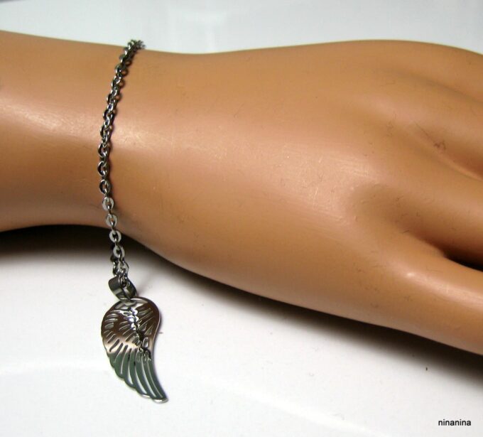 Bracelet aile d’ange acier inoxydable argenté composée d’un pendentif aile d’ange en acier inoxydable argenté monté sur chainette en acier inoxydable argenté. Dim du pendentif : 1,2 X 3 cm. Fermoir mousqueton et chainette de rallongement. Longueur totale (fermoir compris): 19 cm. Livré dans sa pochette d’organza. Bijou 100% fait-main. Poids : 3,4 g