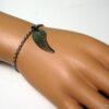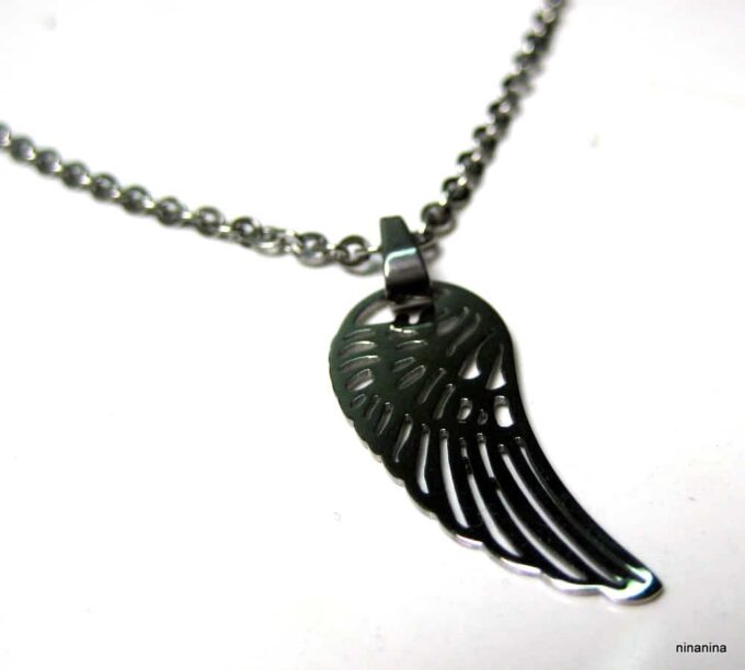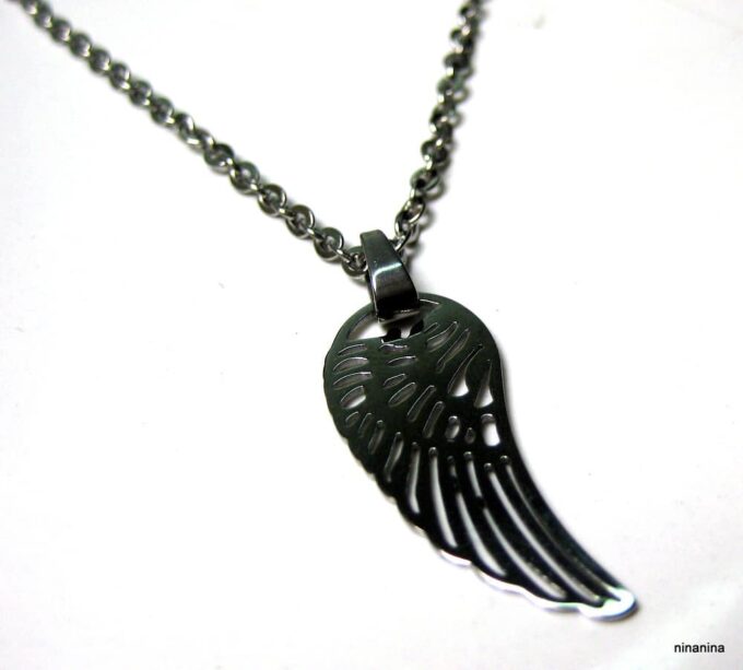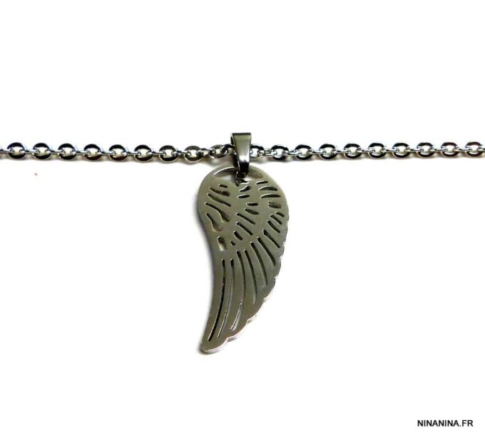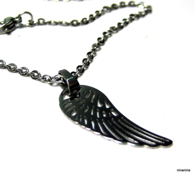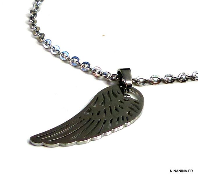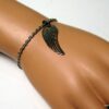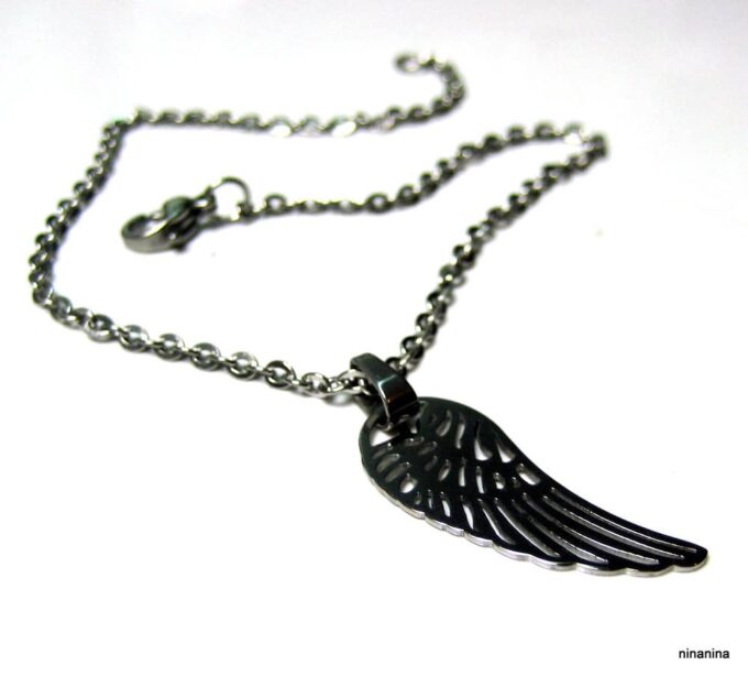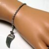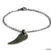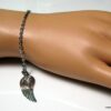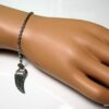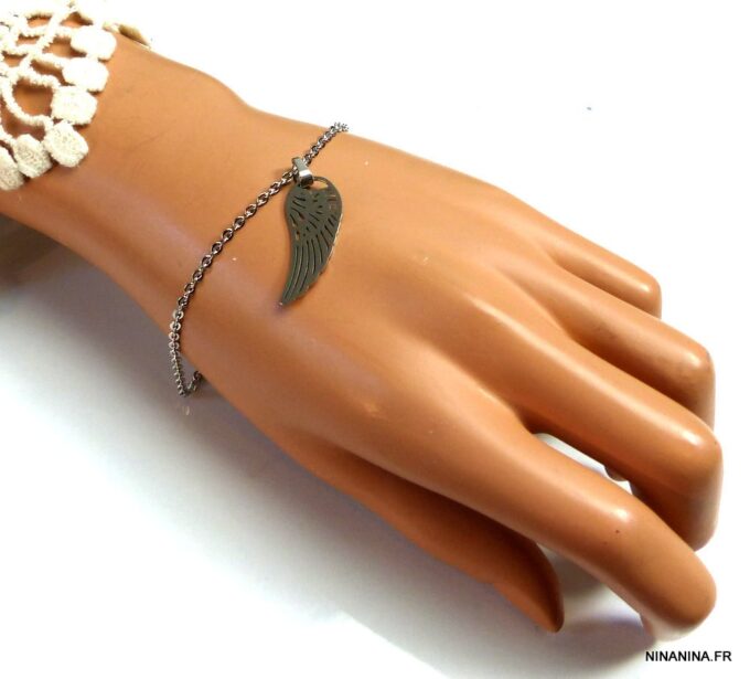 Bracelet aile d’ange acier inoxydable argenté composée d’un pendentif aile d’ange en acier inoxydable argenté monté sur chainette en acier inoxydable argenté. Dim du pendentif : 1,2 X 3 cm. Fermoir mousqueton et chainette de rallongement. Longueur totale (fermoir compris): 19 cm. Livré dans sa pochette d’organza. Bijou 100% fait-main. Poids : 3,4 g
