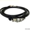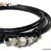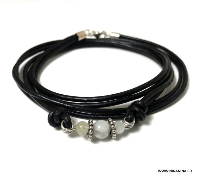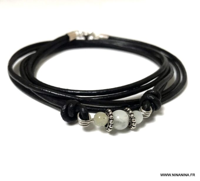 Un bracelet homme cordon original qui enlace le poignet de sa fine lanière de cuir, ce Bracelet pierre de naissance est composé de pierres en aigue marine naturelle de 4 et 6 mm et de deux rondelles en argent 925 montés sur un cordon cuir noir de 2 mm de diamètre. Il est terminé par un fermoir mousqueton en argent 925, sûr et facile d’utilisation.