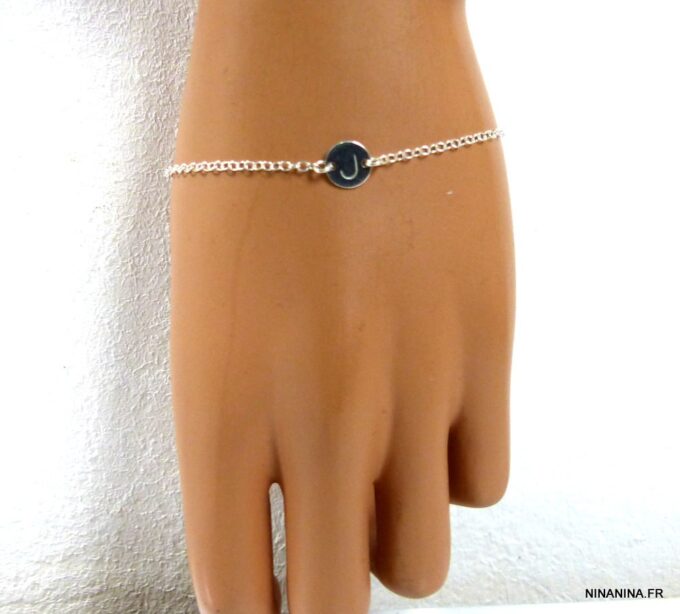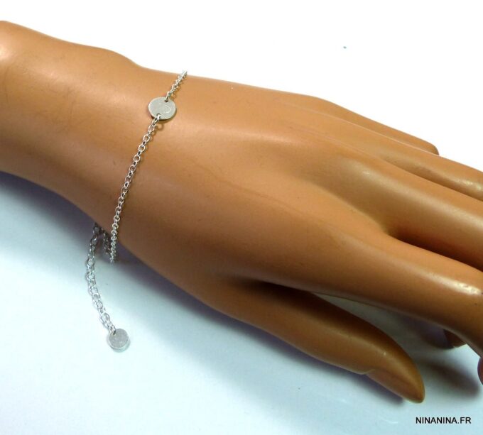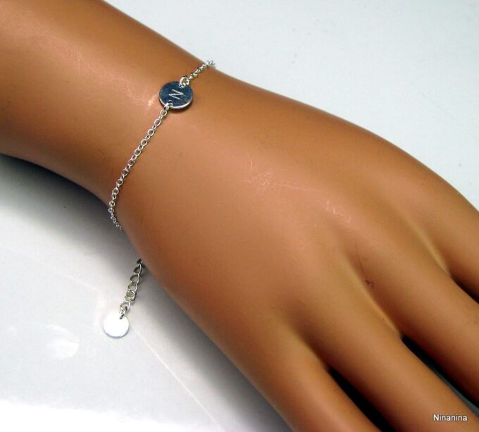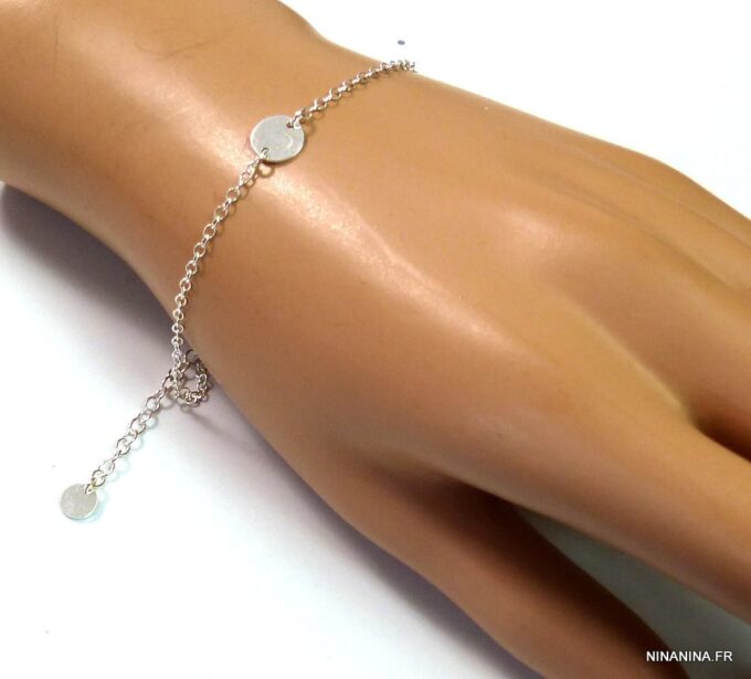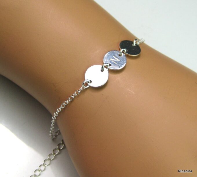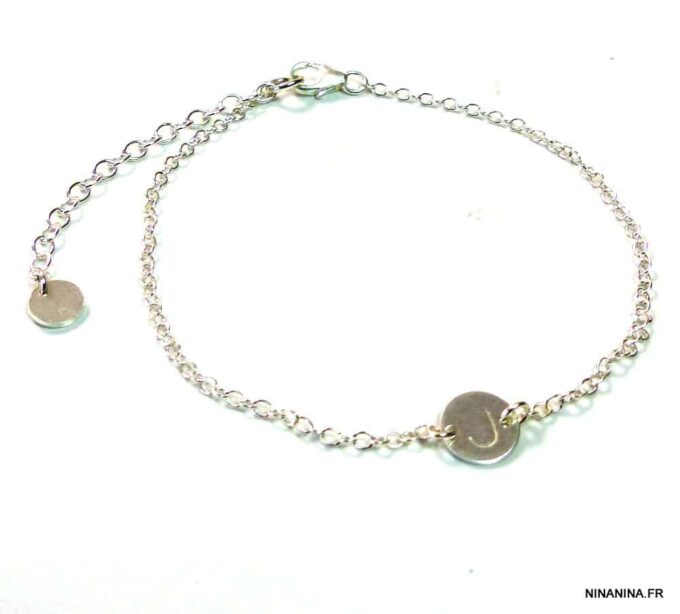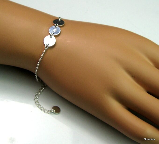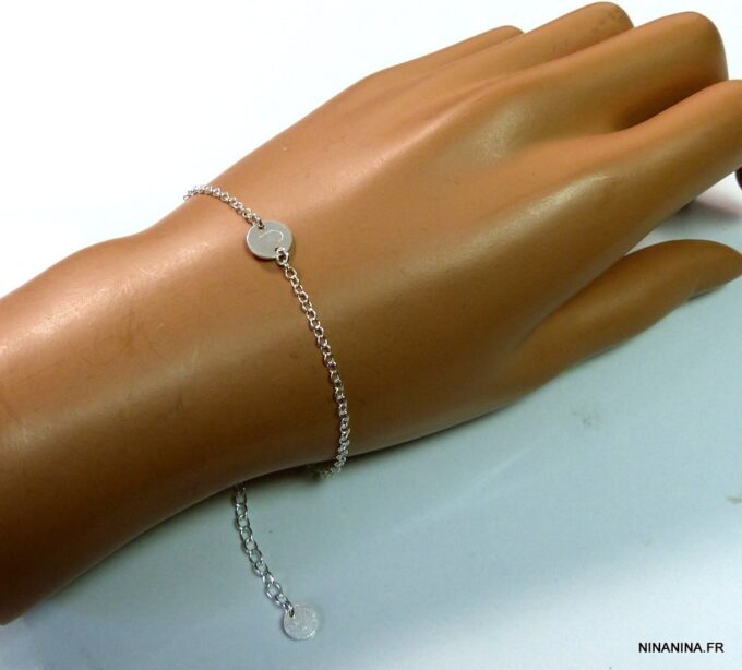 Ce Bracelet femme personnalisé en Argent de grande qualité est unique et fabriqué à la main, de façon artisanale dans notre atelier du sud de la France. Il s’agit d’une pièce faite sur mesure qui convient pour la majorité des poignets féminins, la longueur proposée est réglable de 16 à 22 cm. Merci de laisser un commentaire si vous souhaitez une autre longueur. Diamètre de la pastille : 0,8 cm. Fermoir mousqueton et chainette de réglage. Poids : 1,9 g