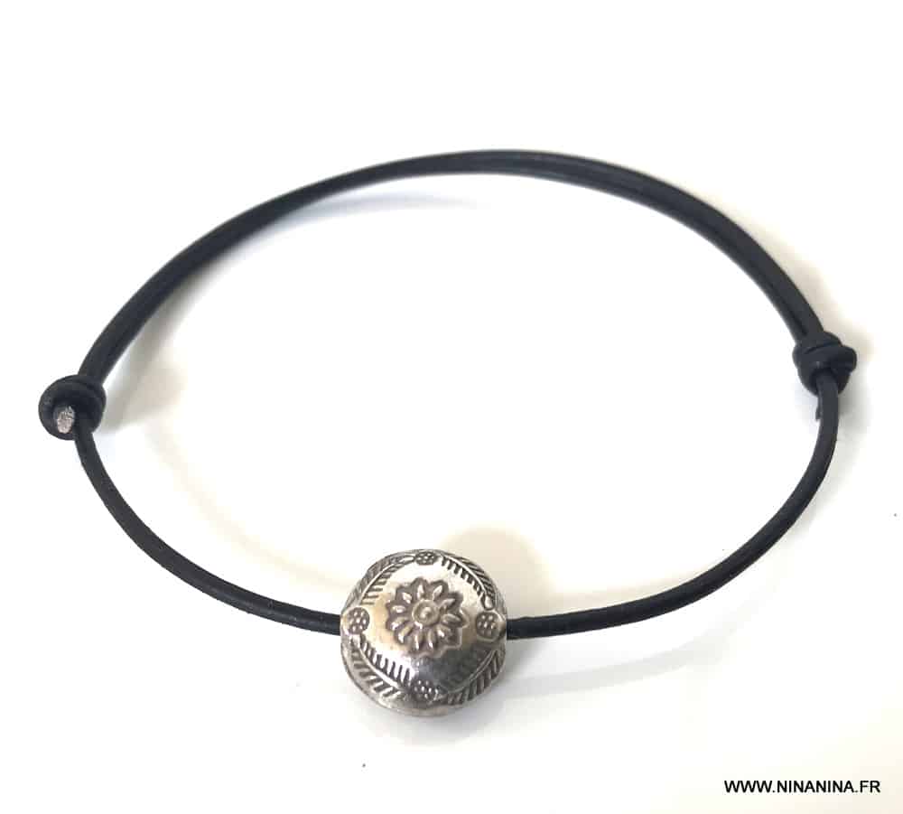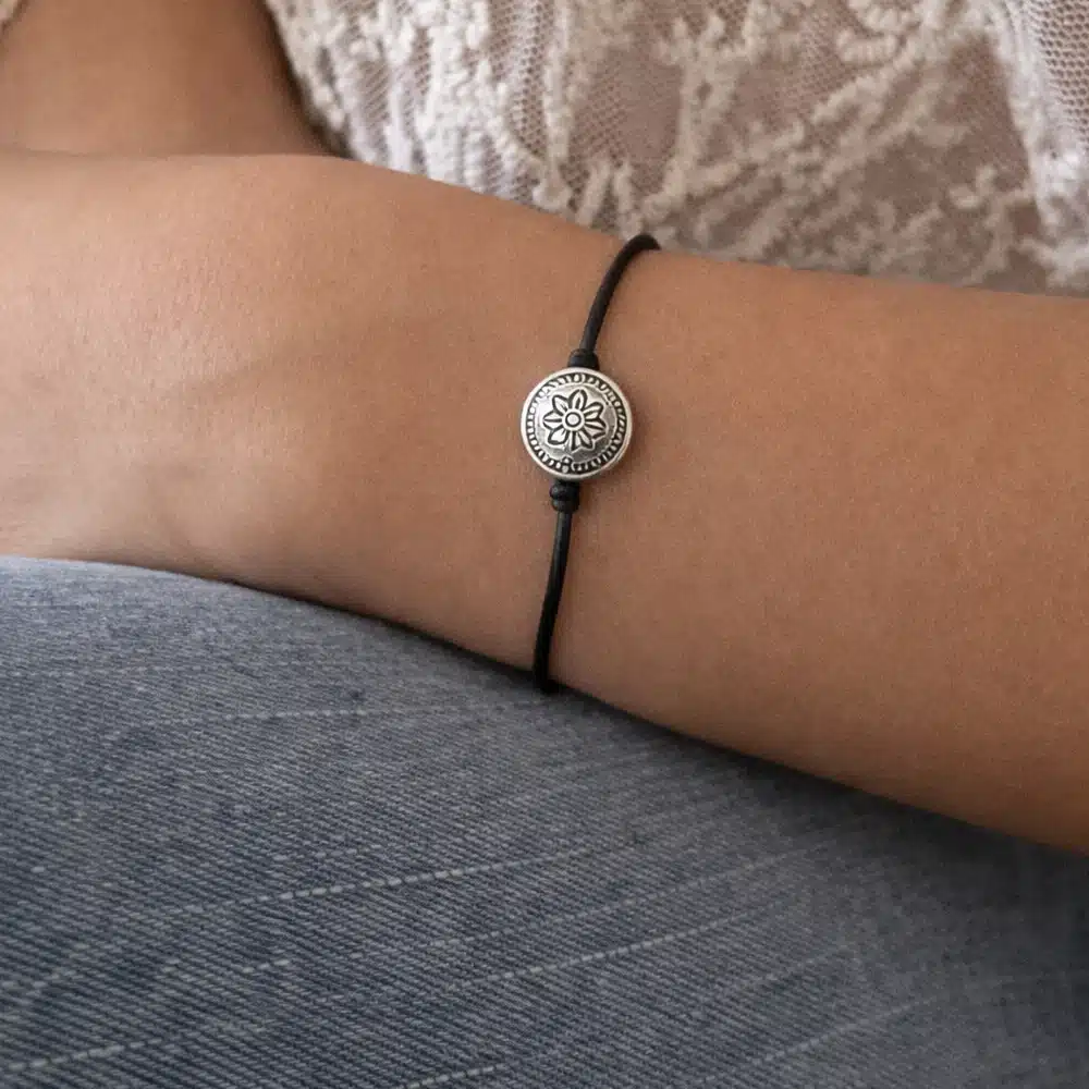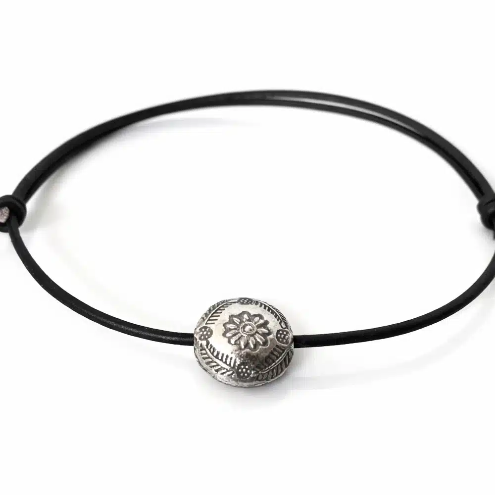 Au centre du bracelet se trouve une perle plate en argent, délicatement gravée d’un motif floral. La fleur, finement travaillée, apporte une touche de douceur et de féminité tout en mettant en valeur le caractère artisanal du bijou. Les détails gravés et la patine de l’argent soulignent le relief et donnent à chaque pièce une identité unique.