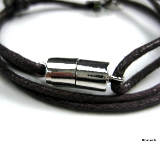 Bracelet homme argent massif coton ciré composé d’une fermoir cylindrique aimanté en argent 925 monté sur un cordon de coton ciré (2mm de diamètre).