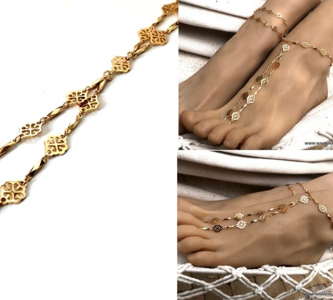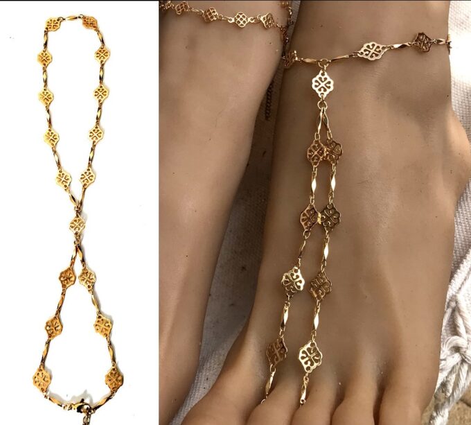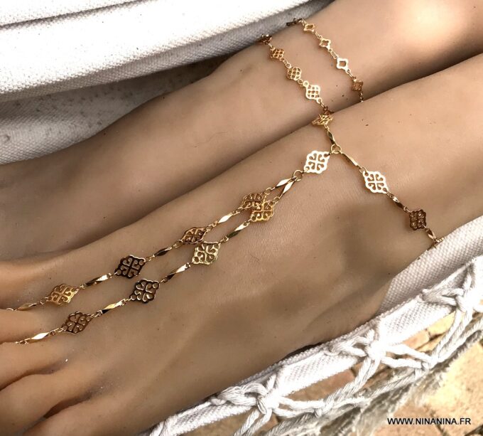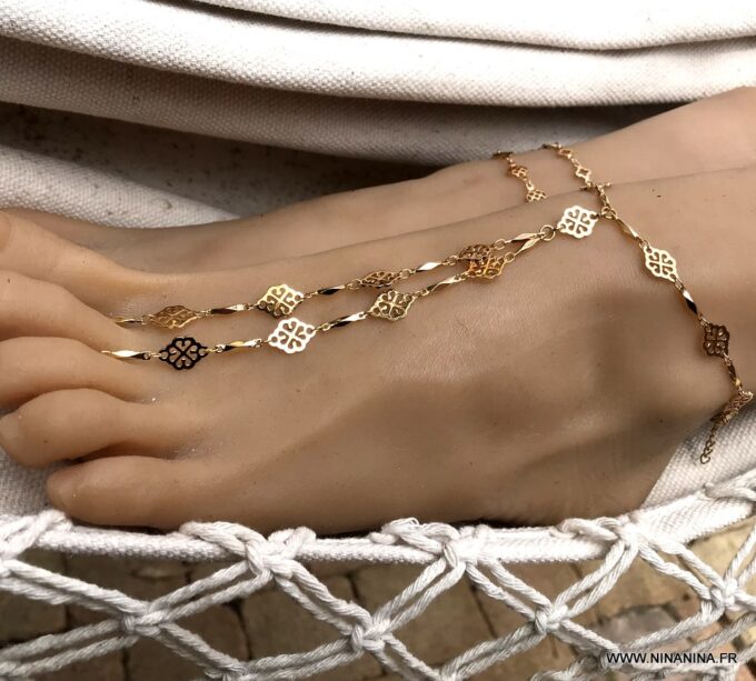 Cette chaine de pied s’enfile à un orteil, court sur le pied et s’attache autour de la cheville.