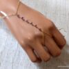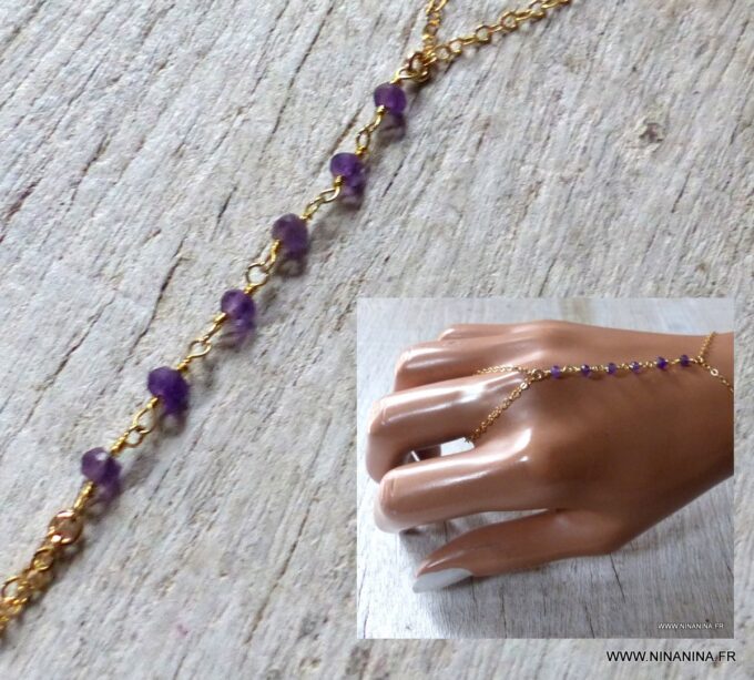 Esprit bohème chic pour ce Bracelet chaine de main améthyste brute plaqué or composé de petites pierres brutes en améthyste véritable montées sur une chaine Plaqué Or, à enrouler autour du doigt.