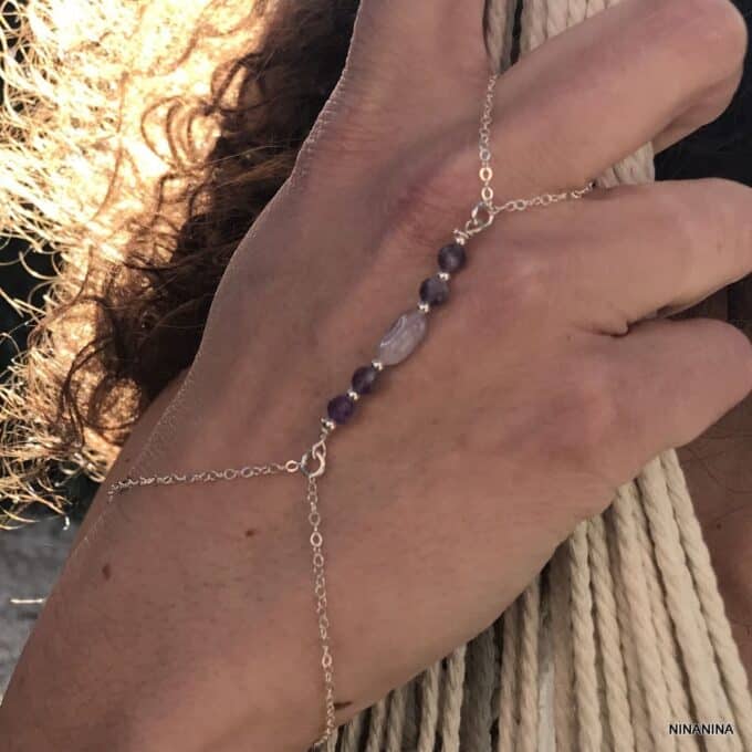 Ce bracelet de main en argent massif 925 relie délicatement le poignet à la base du doigt grâce à une chaînette fine et une rangée de perles d’améthyste naturelles, facettées et polies à la main. En son centre, une améthyste ovale sert de pierre maîtresse, entourée de perles rondes pour un effet équilibré et féminin.