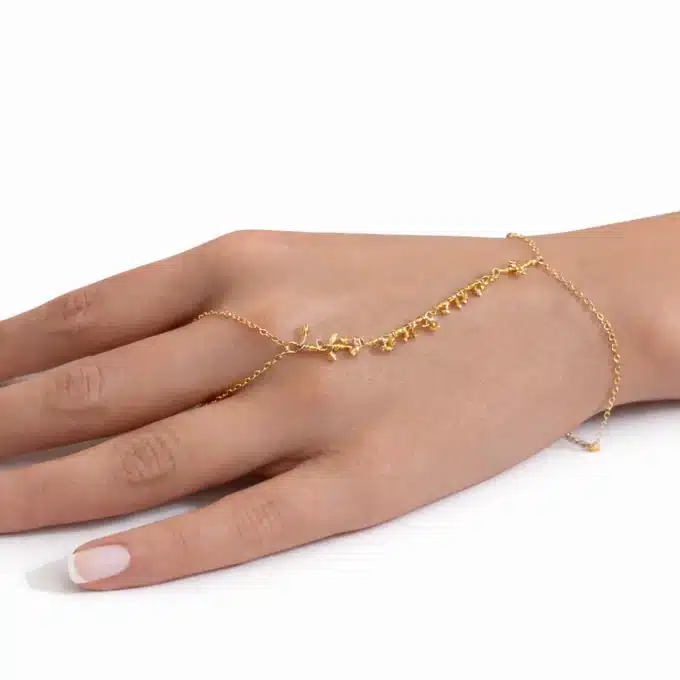 La chaîne plaquée or relie harmonieusement le bracelet au doigt, créant un bijou élégant et féminin qui habille la main avec subtilité. Chaque pierre est soigneusement sélectionnée pour sa teinte lumineuse, rendant chaque création unique.