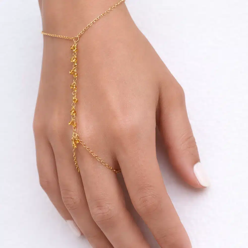 Bracelet bague chaîne main artisanal en citrine jaune et plaqué or. Un bijou raffiné et lumineux qui relie le poignet au doigt avec élégance.