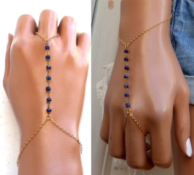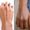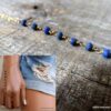 Ajoutez une touche bohème à votre tenue avec ce Bracelet bague – chaine de main plaqué or lapis lazuli composé de petites Pierres en Lapis Lazuli brut montées sur fil plaqué or et terminé par un fermoir rond à ressort, sûr et facile d’utilisation.