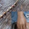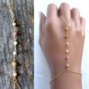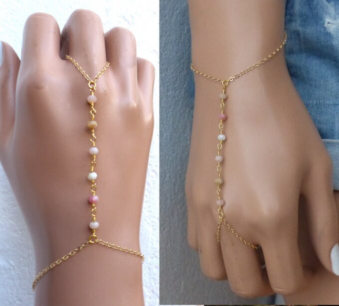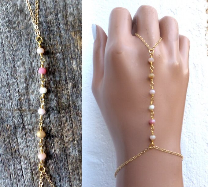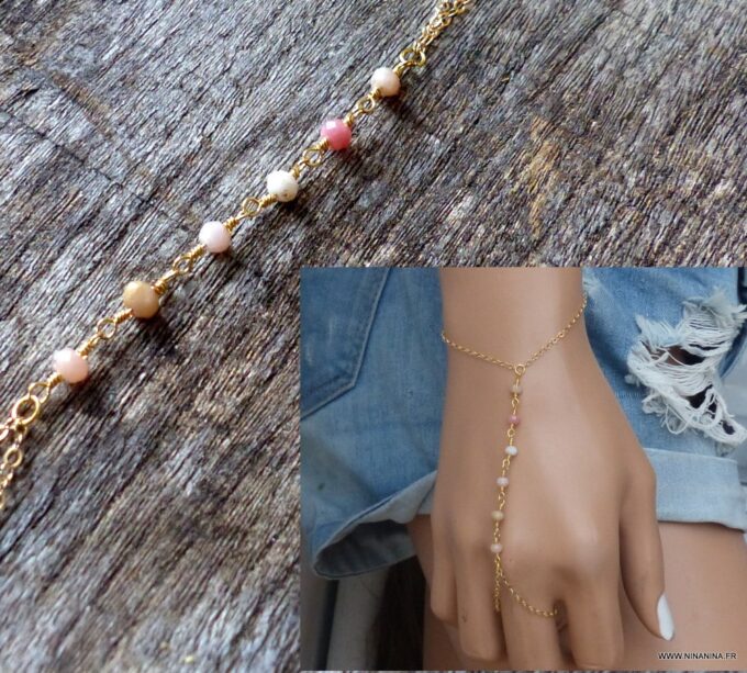 Bracelet bague chaine de main plaqué or opale rose composé de petites pierres brutes en opale rose montées sur chainette en plaqué or 14 carats.