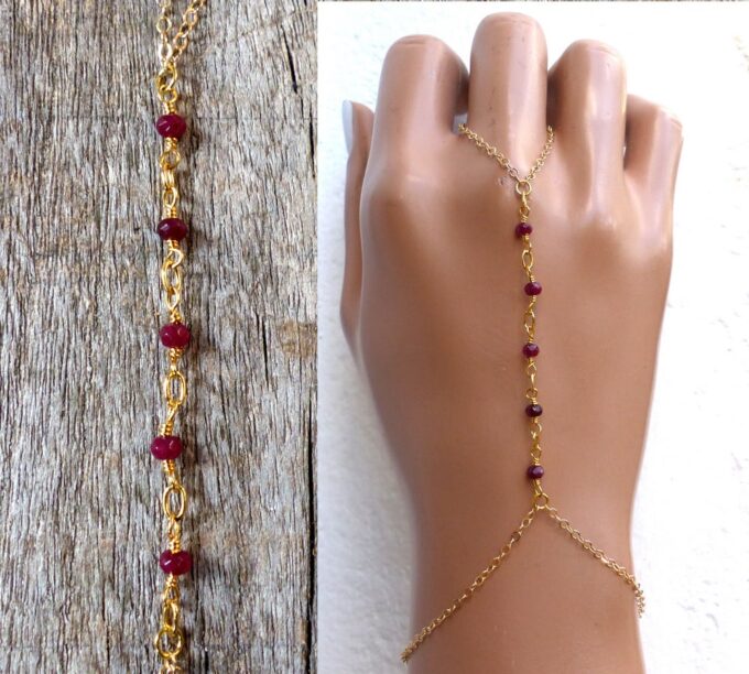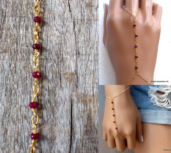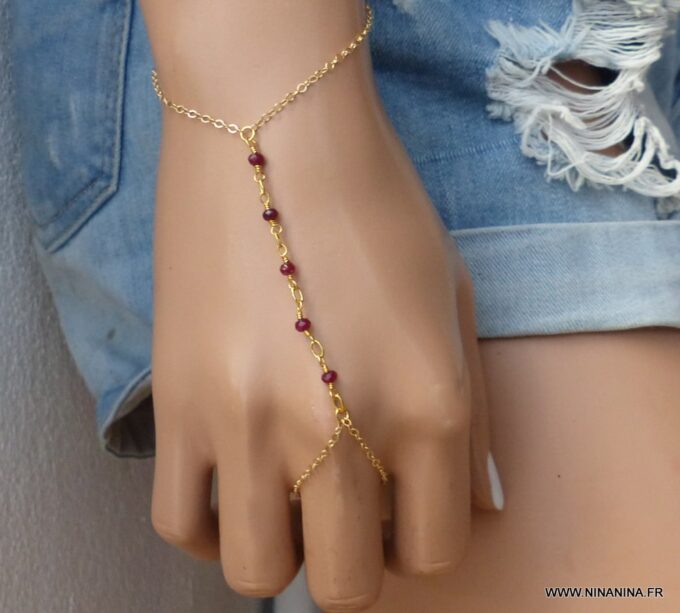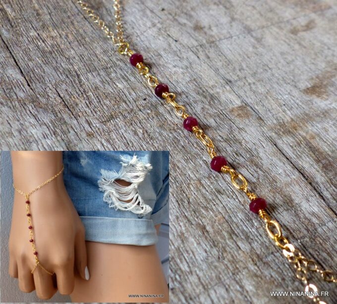 Bracelet bague chaine de main plaqué or et rubis​ composé de petites pierres brutes en rubis montées sur chainette en plaqué or 14 carats.