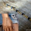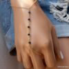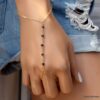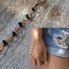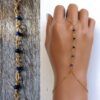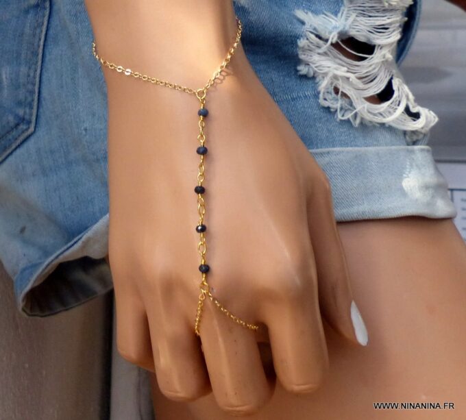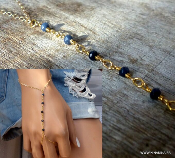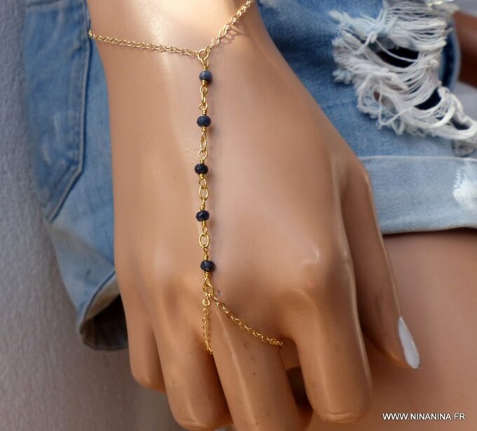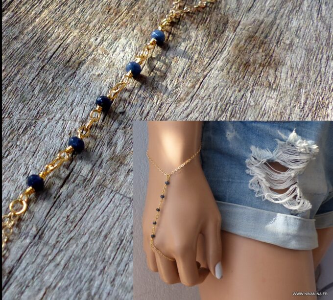 Bracelet bague chaine de main plaqué or et saphir composé de petites pierres brutes en saphir montées sur chainette en plaqué or 14 carats.