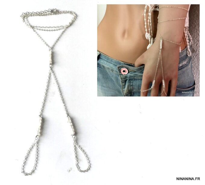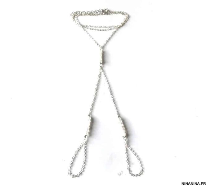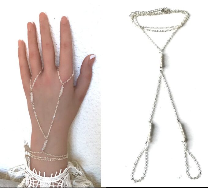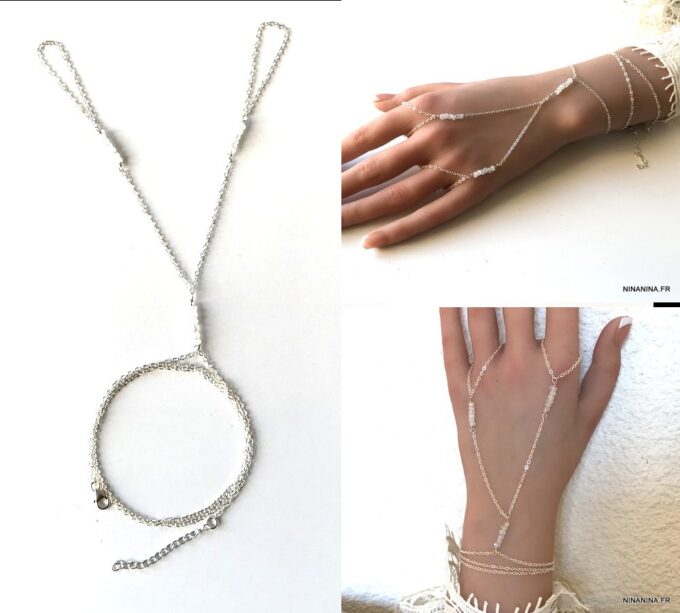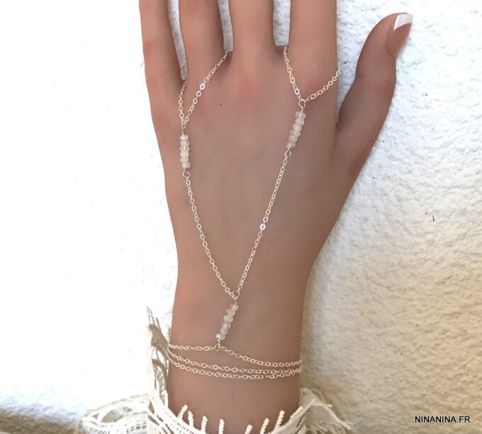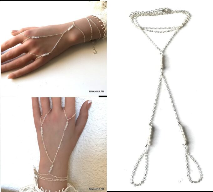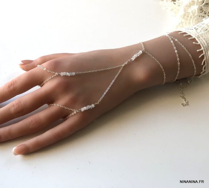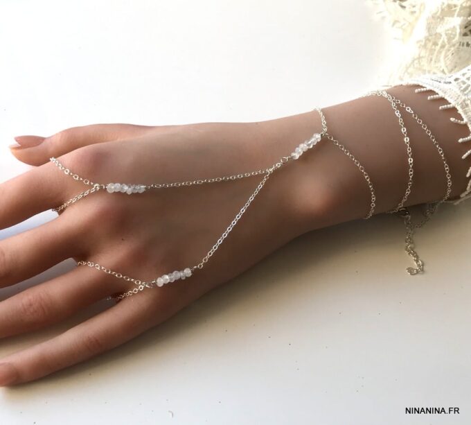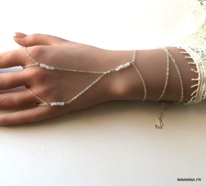 Vous souhaitez modifier ou ajouter une pièce? modifier la couleur ou la matière ? Ce Bracelet bague chaine de main est fait sur mesure et comme la majorité des bijoux Ninanina, est personnalisable. Vous pouvez demander à modifier certaines caractéristiques de ce bijou de mariage. La longueur proposée est de 52 cm mais il est possible d’opter pour une toute autre longueur. De la même façon, vous pouvez choisir une autre pierre semi précieuse que la pierre de lune ou demander à modifier le nombre de tours. Il vous suffit de laisser un commentaire et nous élaborerons ensemble votre nouveau bijou personnalisé.