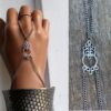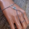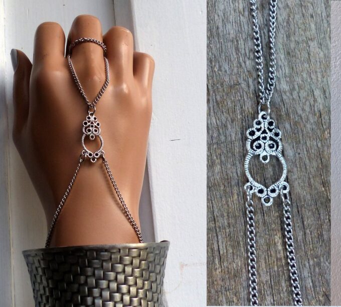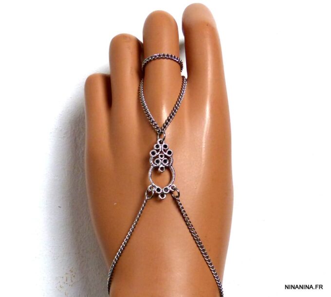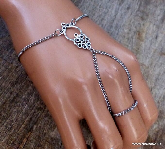 Bracelet bague – parure de main acier inoxydable composé d’un motif filigrané en métal argenté vieilli montée sur une chaînette en acier inoxydable argenté à enrouler autour du doigt.
