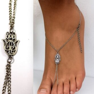 Bracelet bague chaine main de fatma acier inoxydable composé d’une main de fatma en métal argenté montée sur une chaînette en acier inoxydable à enrouler autour du doigt.