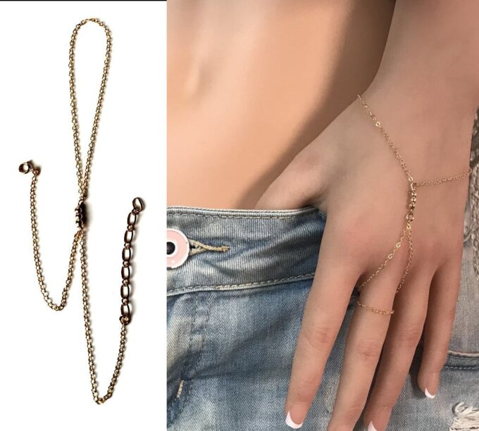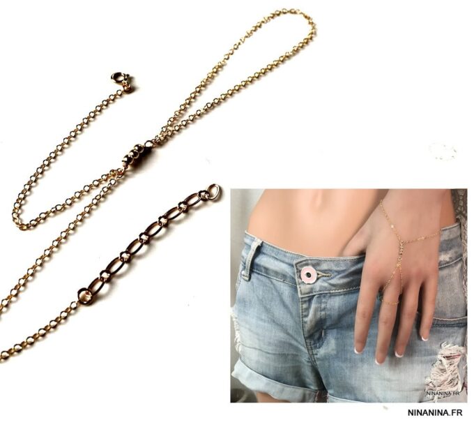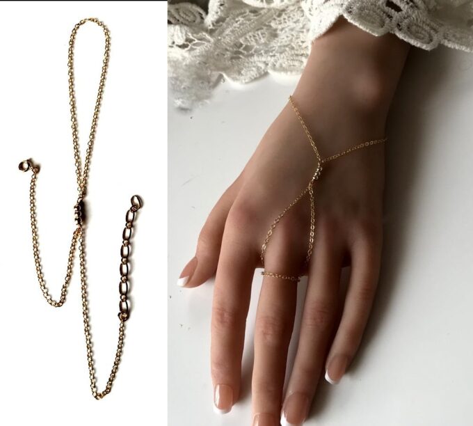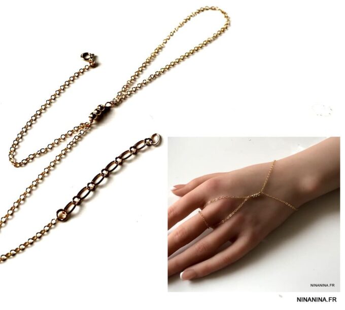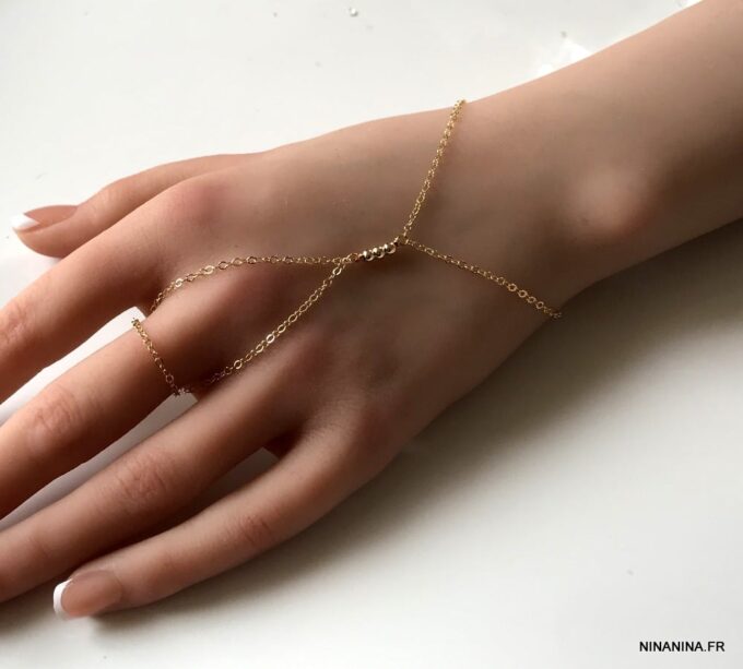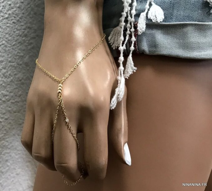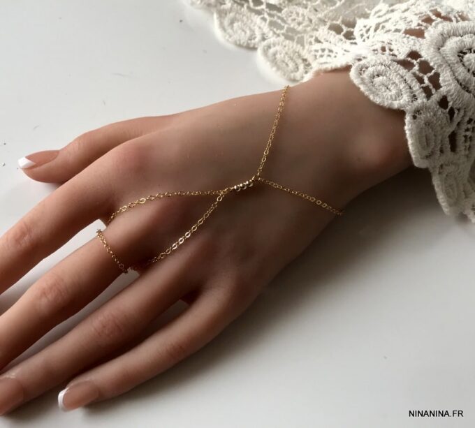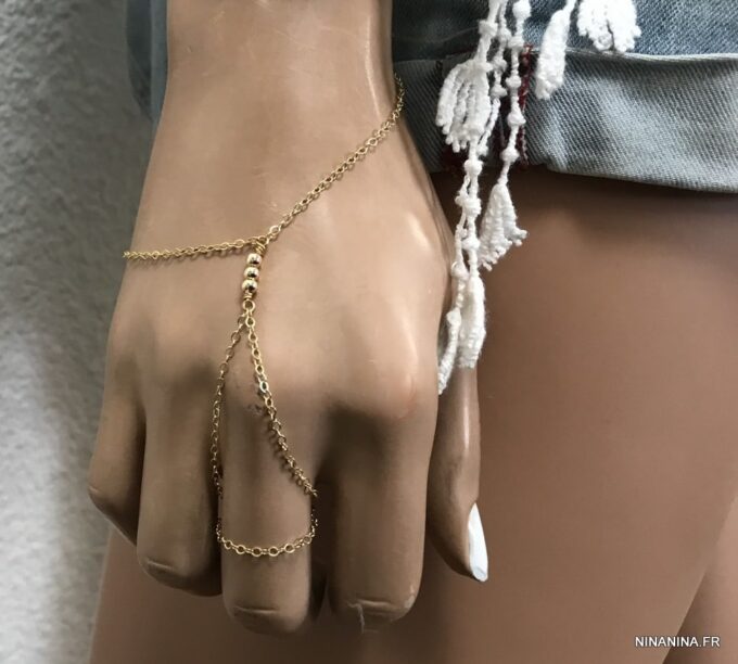Chaine de main perles plaqué or – bracelet bague composé de 3 perles rondes en plaqué or 14 carats montées sur une fine chaînette en plaqué or 14 carats gold filled à enrouler autour du doigt.