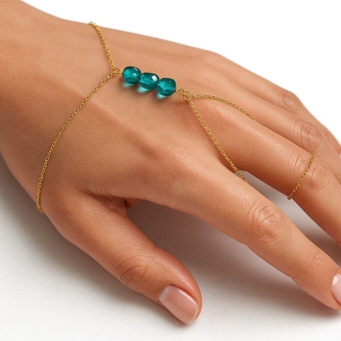 Pour sublimer votre main, enroulez délicatement la chaînette autour du doigt afin de former la bague, puis attachez le bracelet autour du poignet. La fine chaîne dorée se tend alors avec élégance, reliant vos gestes à la lumière. Chaque mouvement devient une caresse dorée, une touche de grâce qui habille la main comme un bijou de peau.