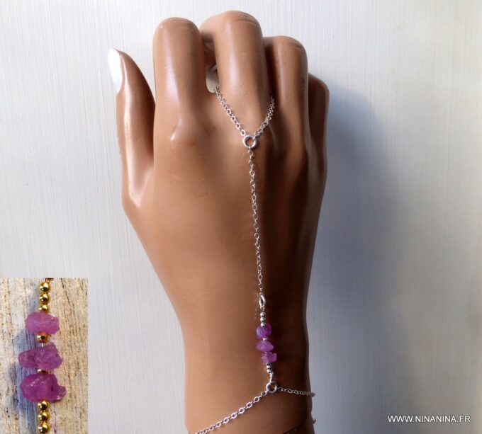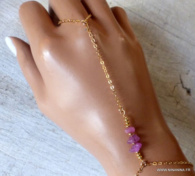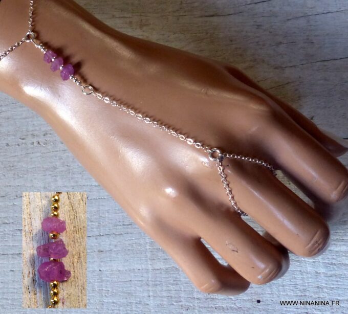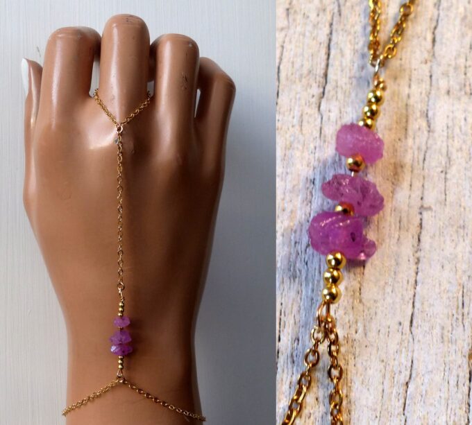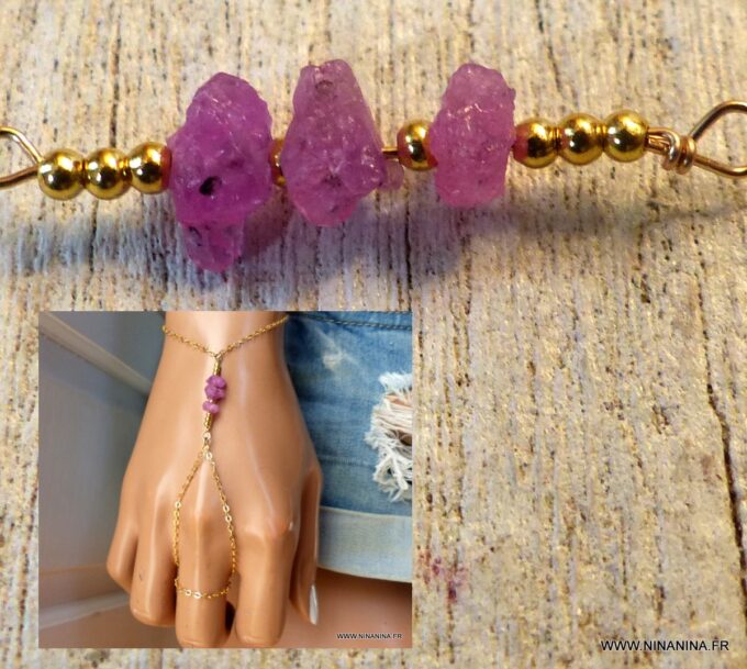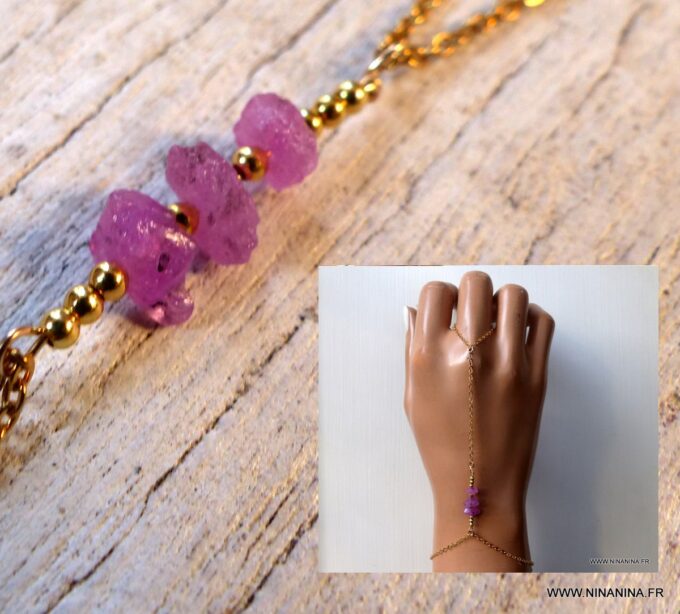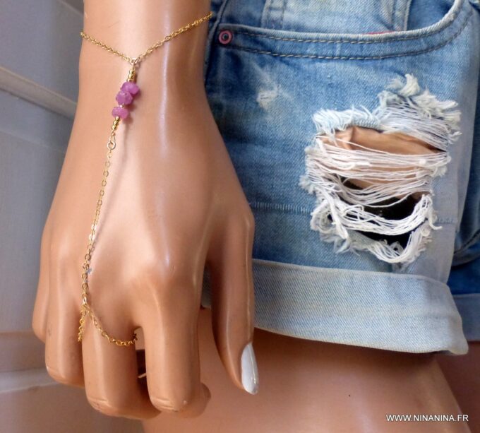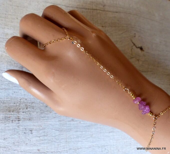 Esprit bohème chic pour ce Bracelet bague saphir pierre de naissance septembre plaqué or composé de petites pierres brutes en saphir rose véritable montées sur une chaine Plaqué Or, à enrouler autour du doigt, Cette jolie chaîne de main appelé également Bracelet bague est un bijou peu commun, qui peut se révéler d’une delicatesse et d’un raffinement exquis! Portez ce joli Bijou de main tendance seul pour un look minimaliste ou mixé à d’autres Bracelets Ninanina.