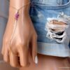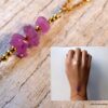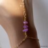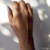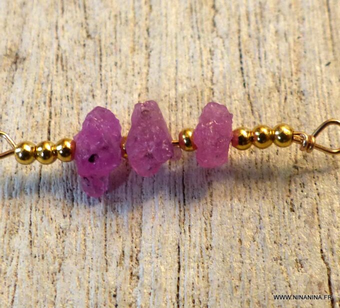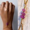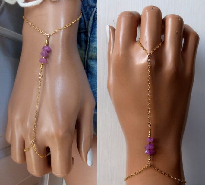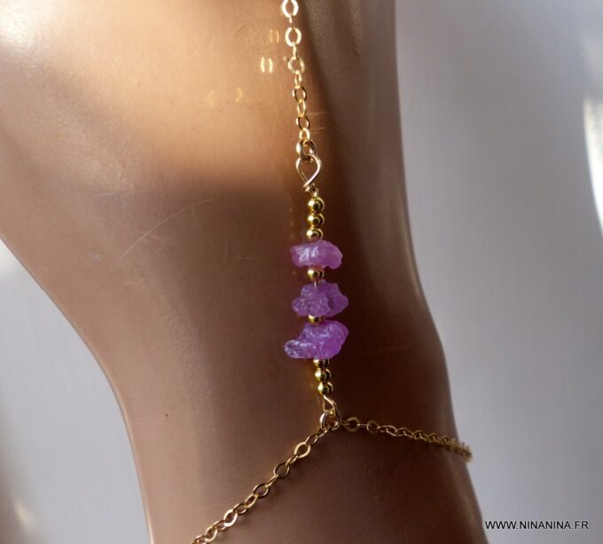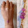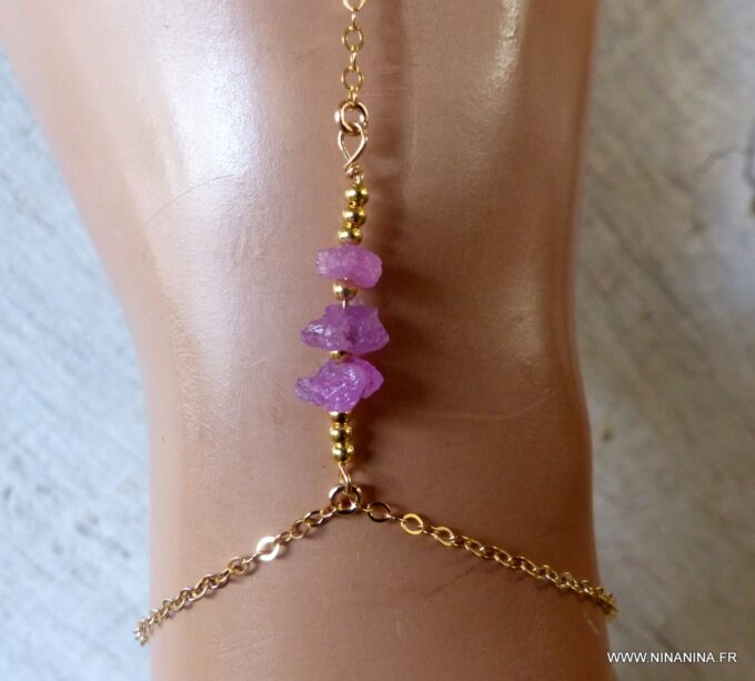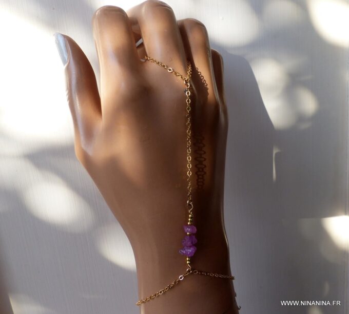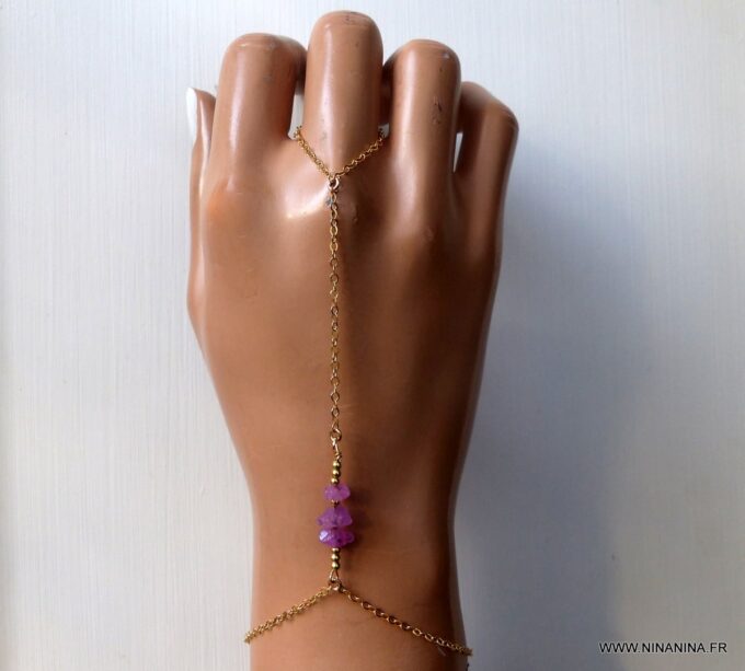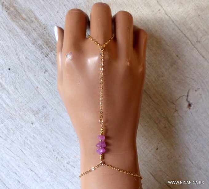 Esprit bohème chic pour ce Bracelet bague saphir pierre de naissance septembre plaqué or composé de petites pierres brutes en saphir rose véritable montées sur une chaine Plaqué Or, à enrouler autour du doigt, Cette jolie chaîne de main appelé également Bracelet bague est un bijou peu commun, qui peut se révéler d’une delicatesse et d’un raffinement exquis! Portez ce joli Bijou de main tendance seul pour un look minimaliste ou mixé à d’autres Bracelets Ninanina.