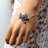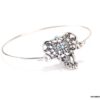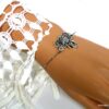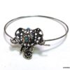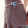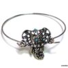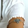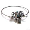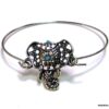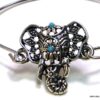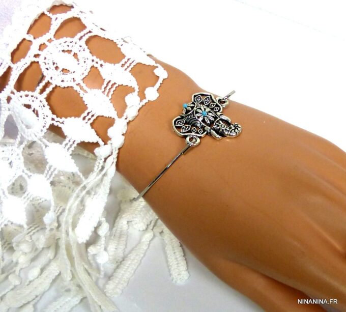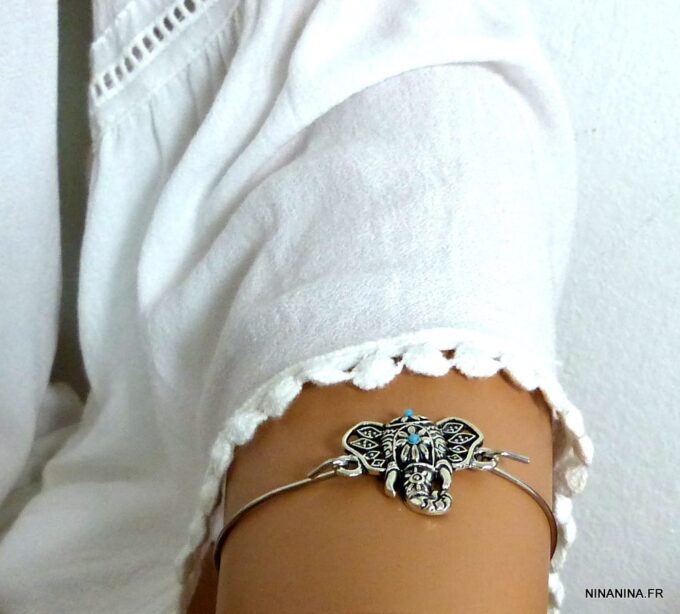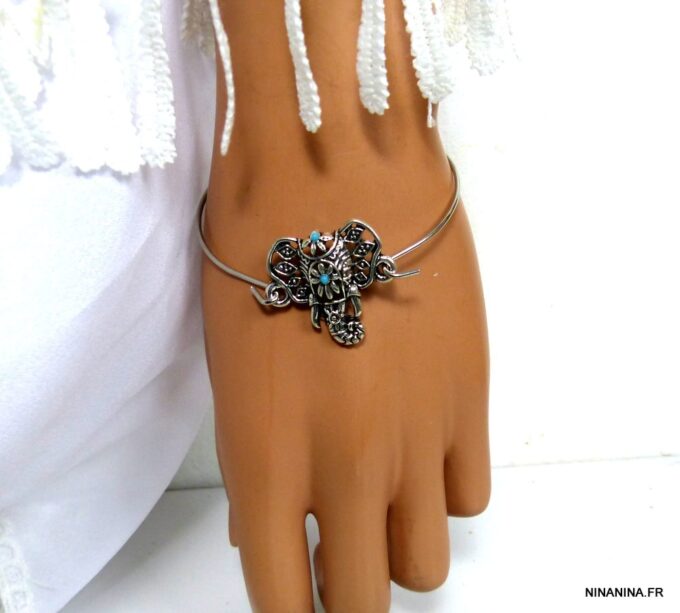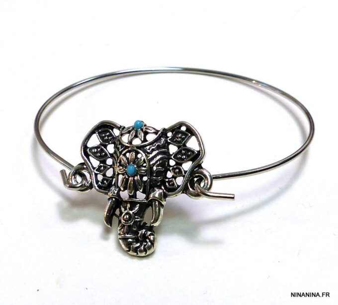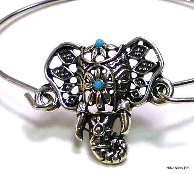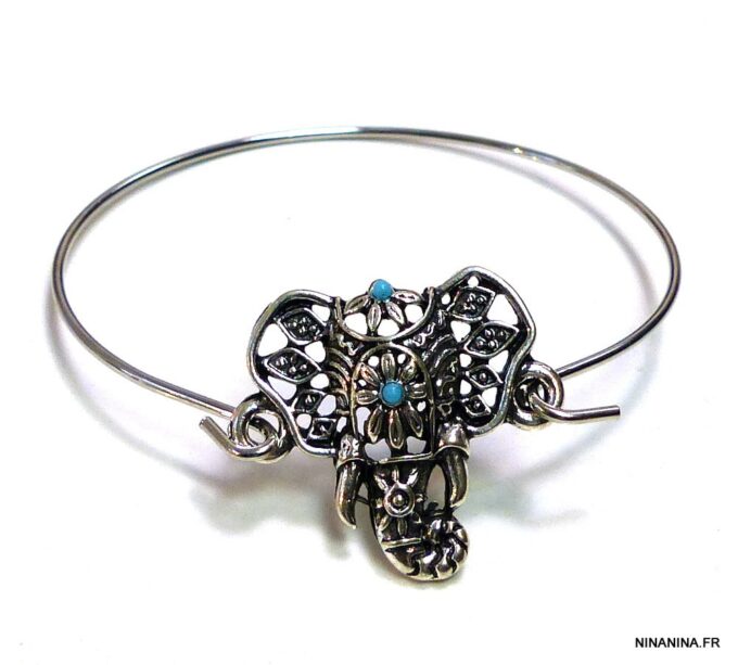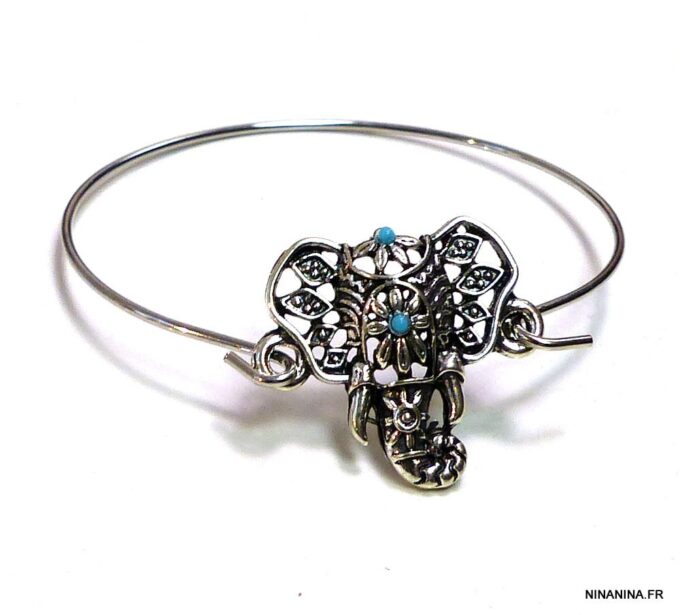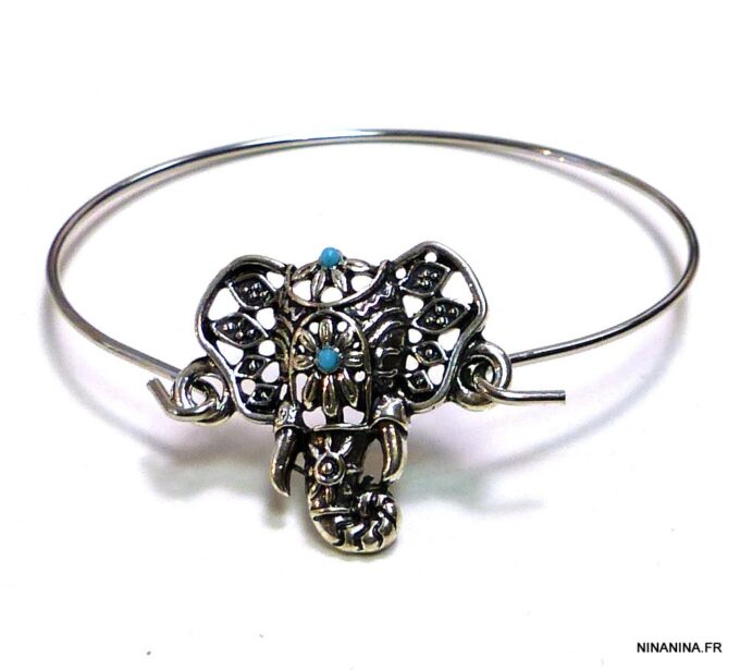 Bracelet bohème éléphant en métal argenté et magnésite turquoise composé d’un éléphant en métal argenté et magnésite turquoise monté sur un jonc en métal argenté. Diamètre : 6,8 cm. Epaisseur : 0,2 env. Livré dans sa pochette d’organza.