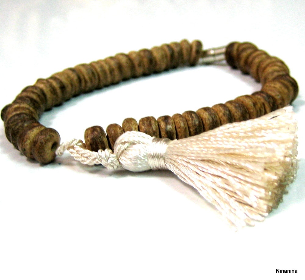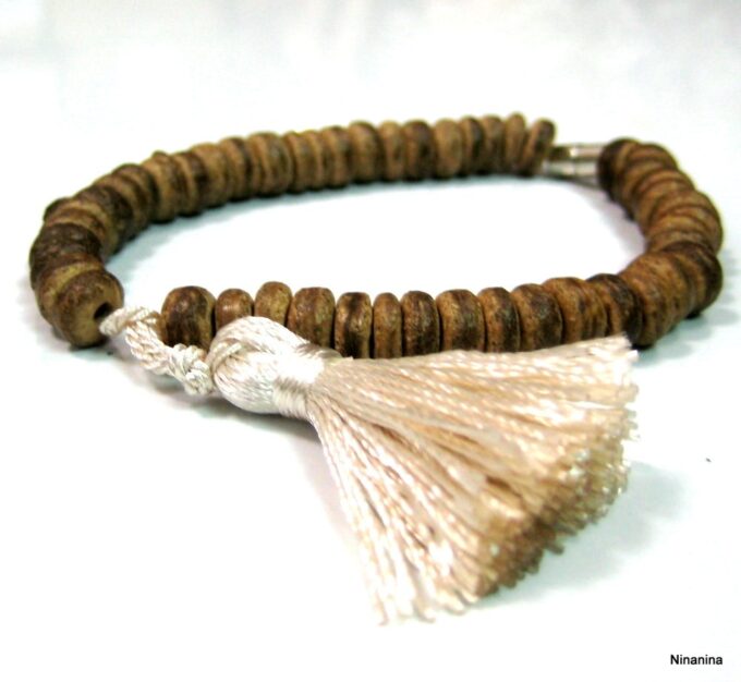 Bracelet rondelles bois pompon blanc cassé composé d’un pompon blanc cassé monté sur un rang de rondelles de bois marron chocolat (5mm de diamètre). Longueur du pompon : 4 cm. Fermoir mousqueton et chainette de rallongement. Longueur totale réglable (fermoir compris): 19 cm env. Livré dans sa pochette d’organza. Bijou 100% fait main.