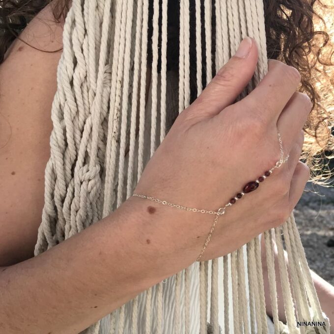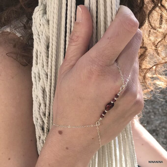Cette chaîne de main en argent relie une bague délicate à un bracelet fin, créant un effet de bijou fluide et captivant. En son centre, une composition de pierres naturelles de grenat, avec une pierre ovale centrale et des perles facettées tout autour, ajoute profondeur et caractère à l’ensemble.
