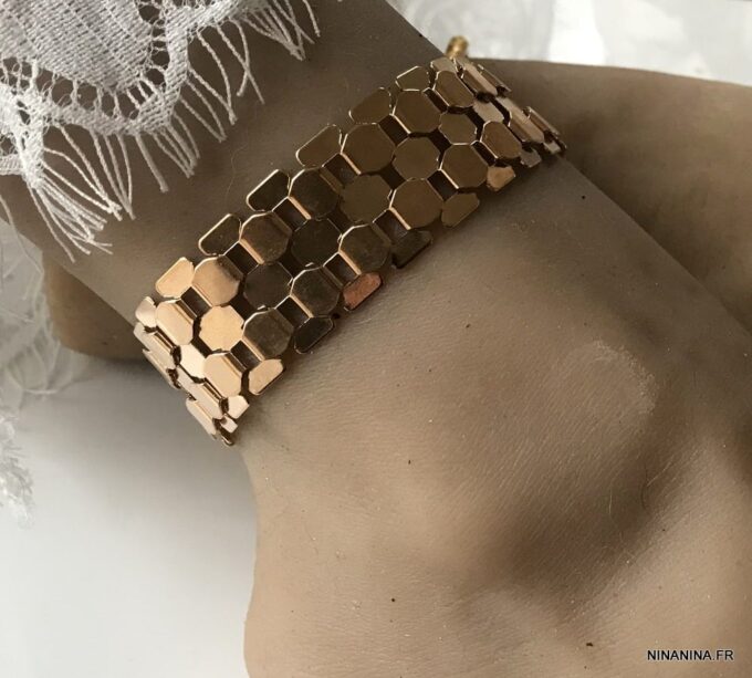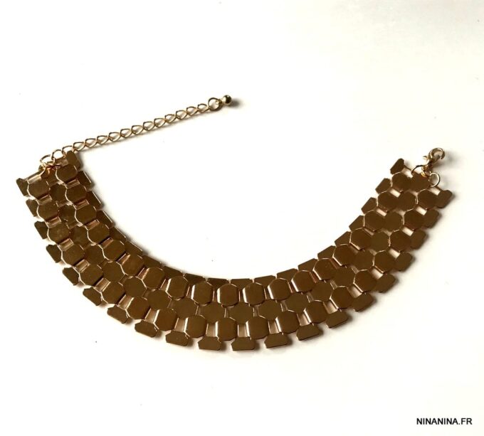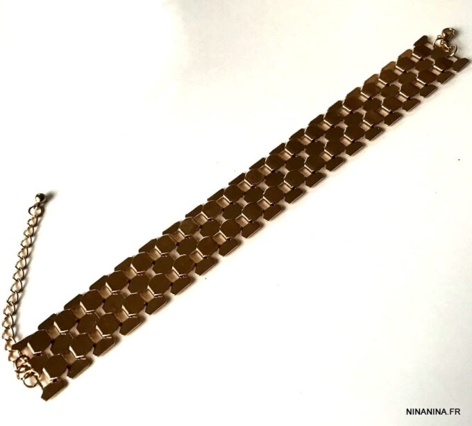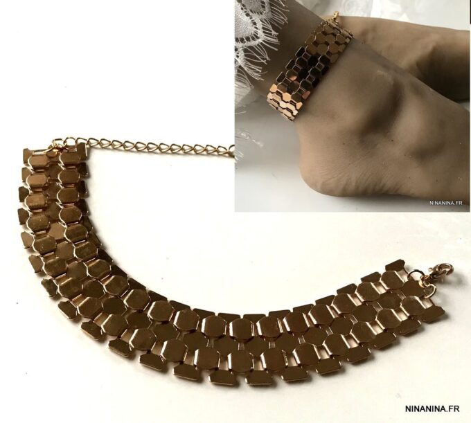 Vous allez être séduite par ce superbe Bracelet cheville large doré femme et homme constitué d’une large chaine à motifs géométriques terminée par un fermoir mousqueton sûr et facile d’utilisation et une chainette de réglage.