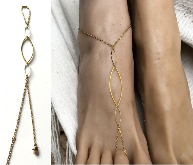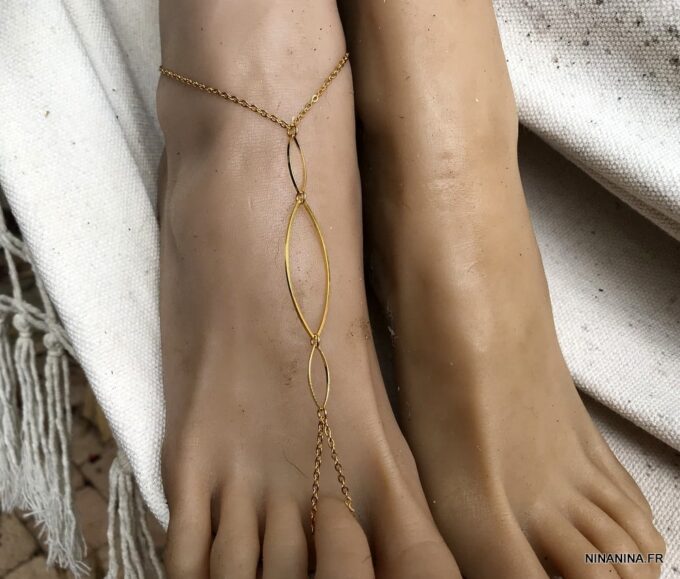 Cette chaine de pied s’enfile à un orteil, court sur le pied et s’attache autour de la cheville.