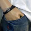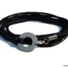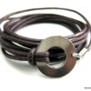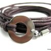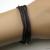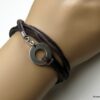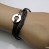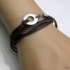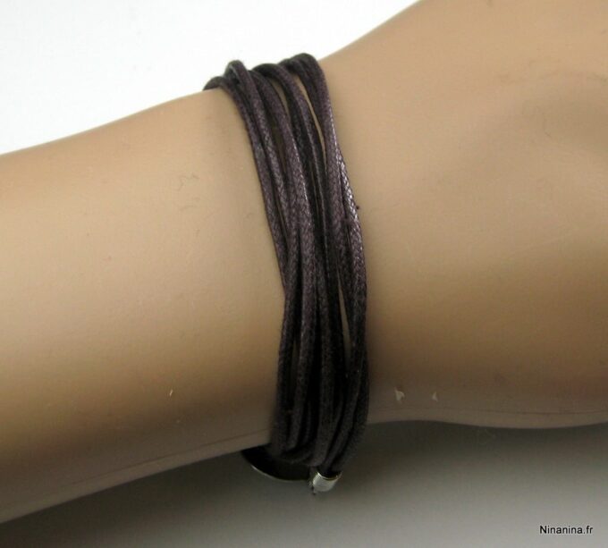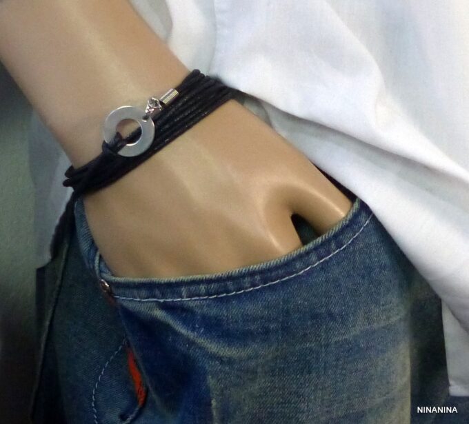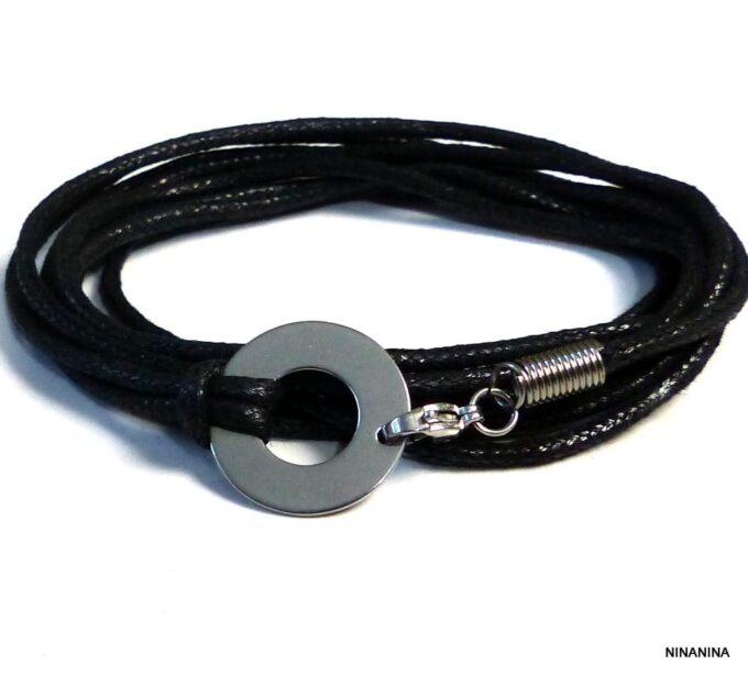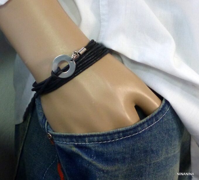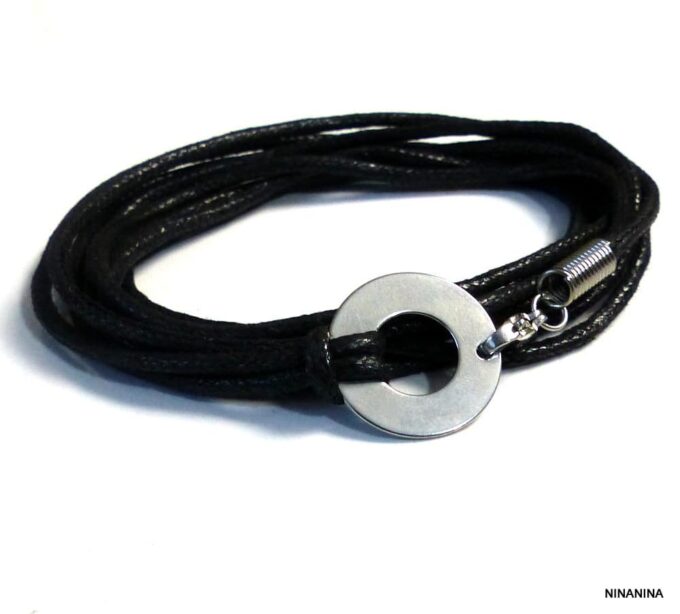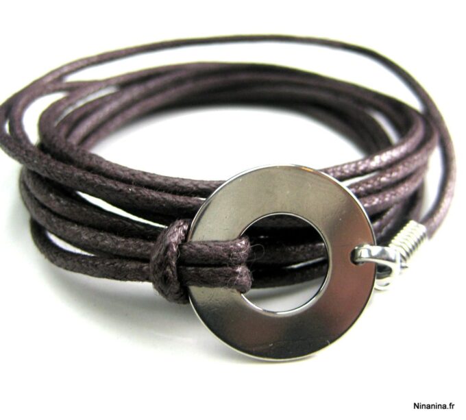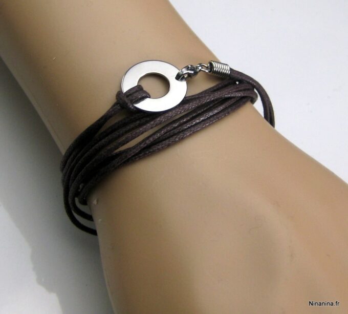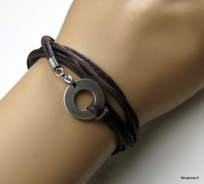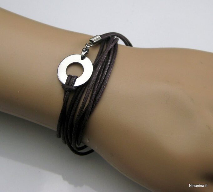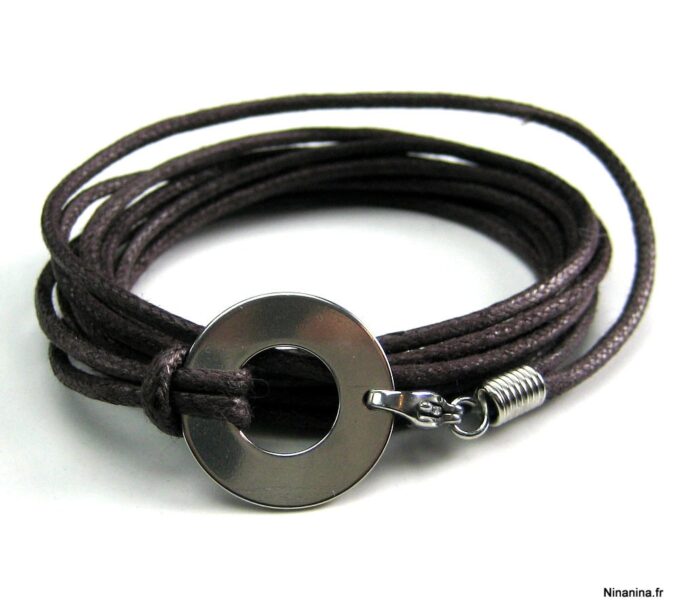 Bracelet homme cordon 4 tours cible acier argenté composé d’un disque en acier inoxydable monté sur un lien de coton ciré (2mm de large).
