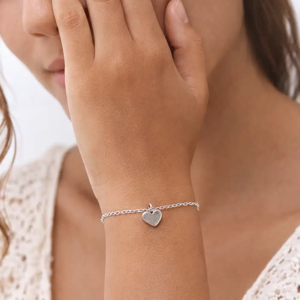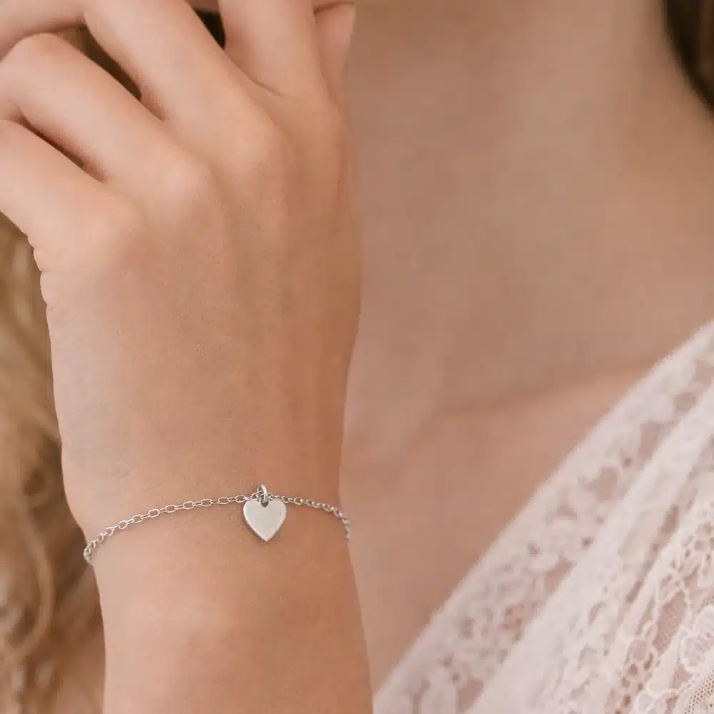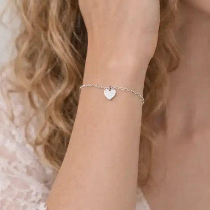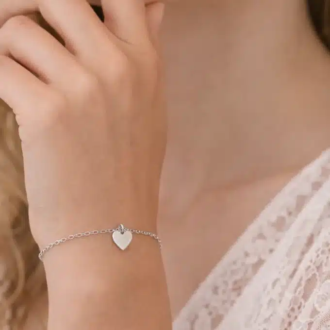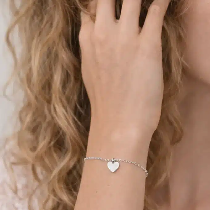 Au centre du bracelet, un pendentif cœur lisse en argent 925 apporte une touche douce et symbolique. Le cœur, aux lignes épurées et à la surface polie, reflète subtilement la lumière et souligne l’éclat naturel de l’argent. Son design minimaliste en fait un bijou facile à porter, à la fois moderne et chargé de sens.