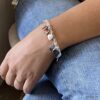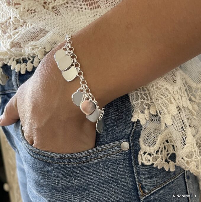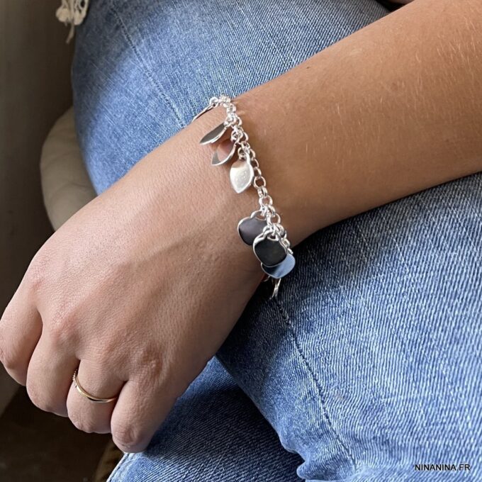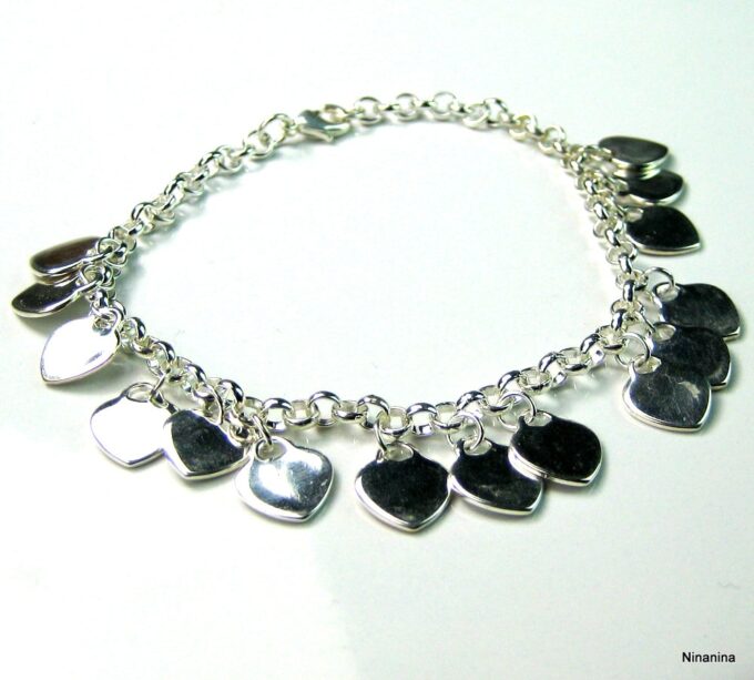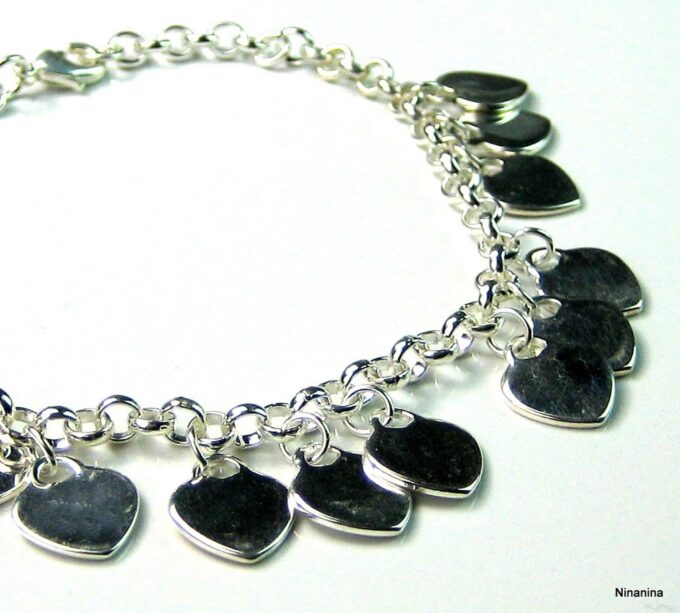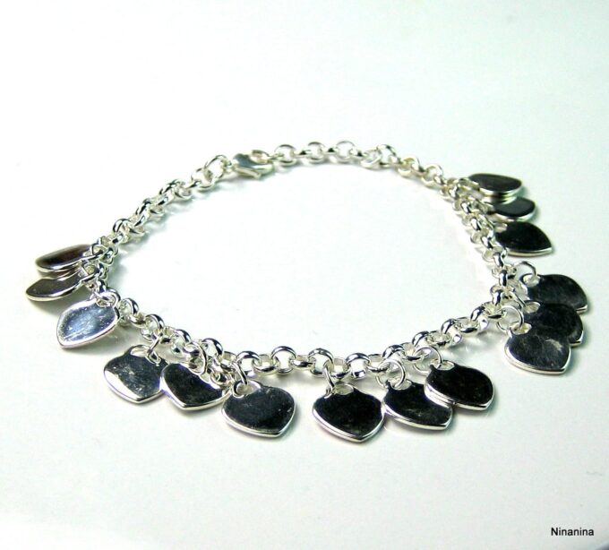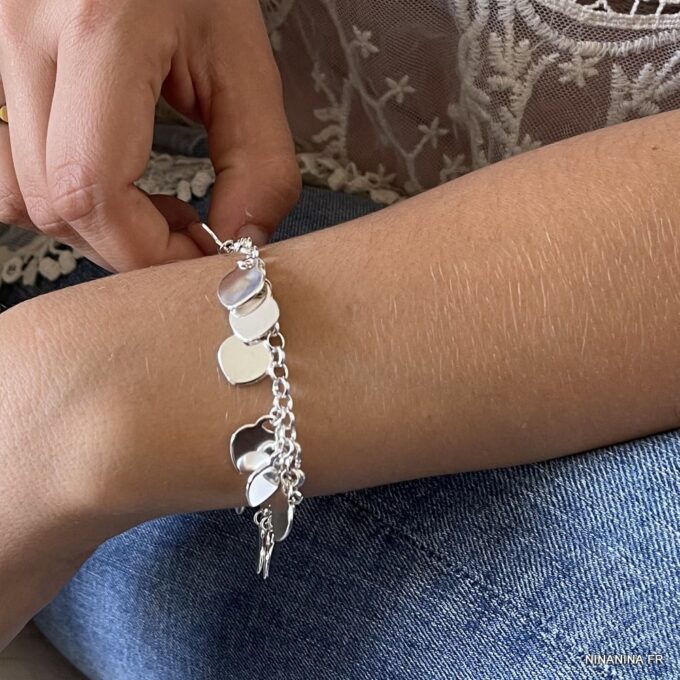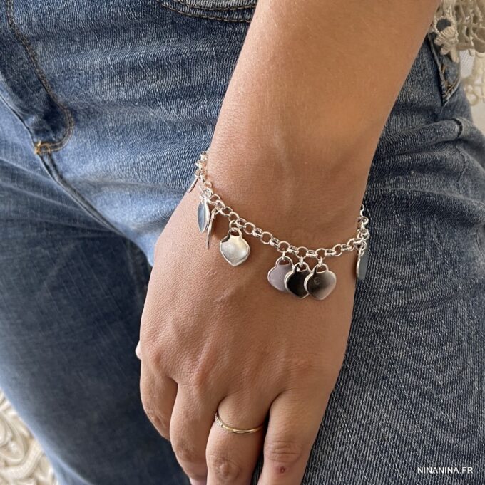 Bracelet coeur Argent 925 plaqué pour femme composé de pendentif coeurs montés sur chaine maillons ronds en plaqué argent.