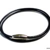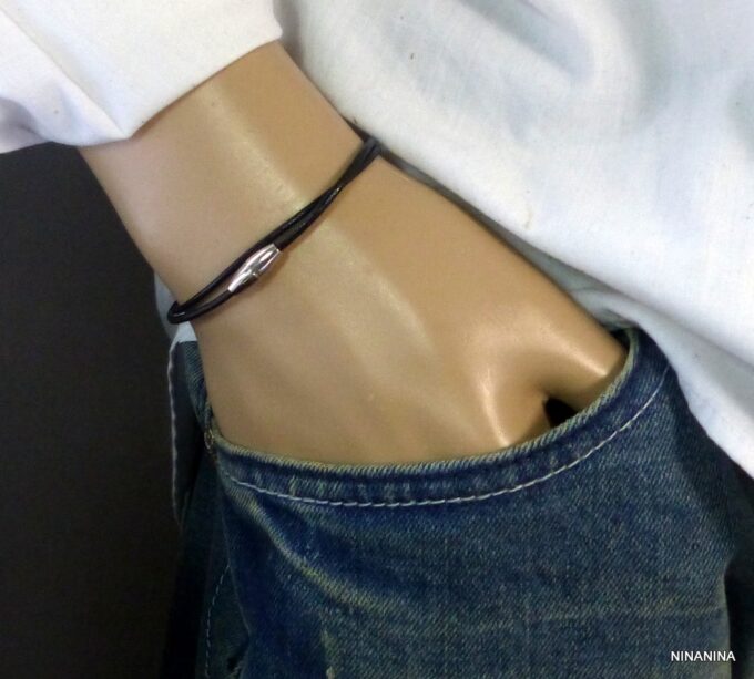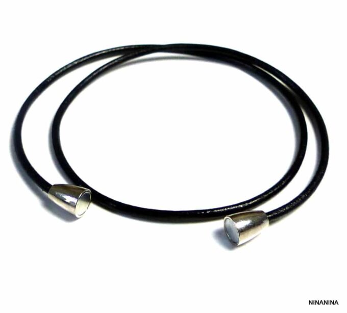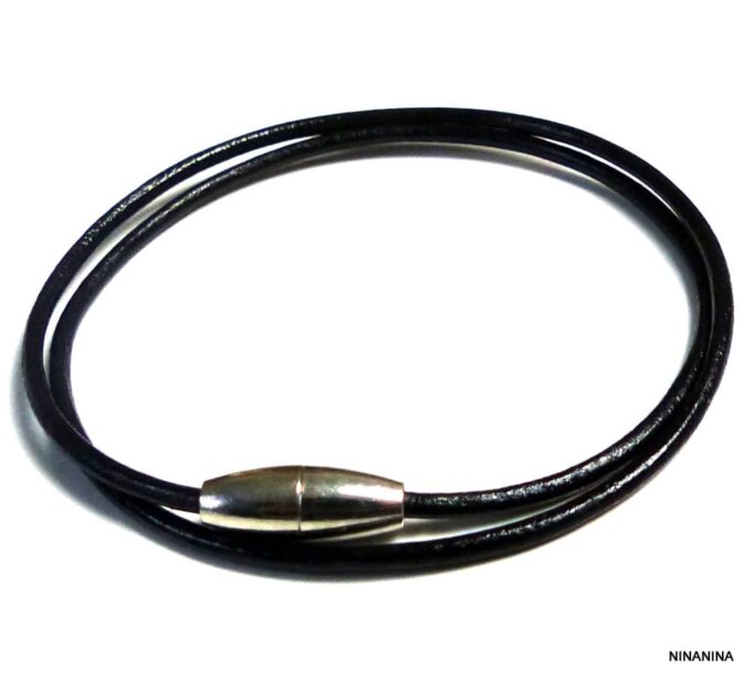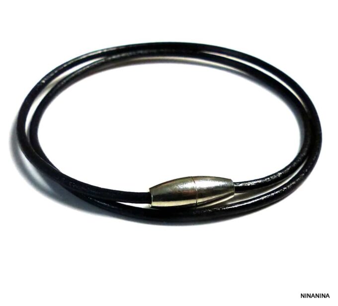 Bracelet double tour femme cordon cuir fermoir acier aimanté composé d’un cordon de cuir noir (2 mm de diamètre) à enrouler autour du poignet (2 tours) monté sur un fermoir aimanté cylindrique en acier inoxydable.