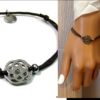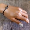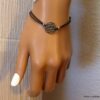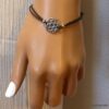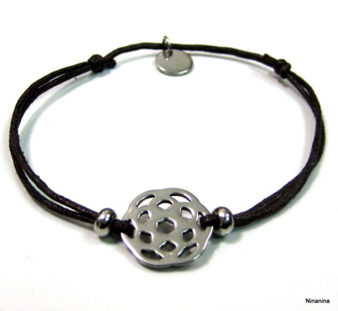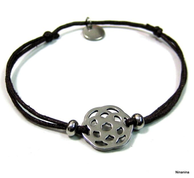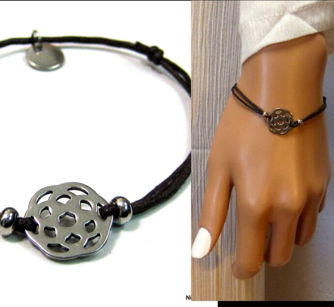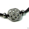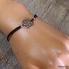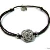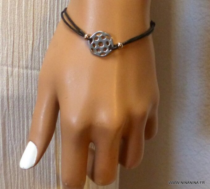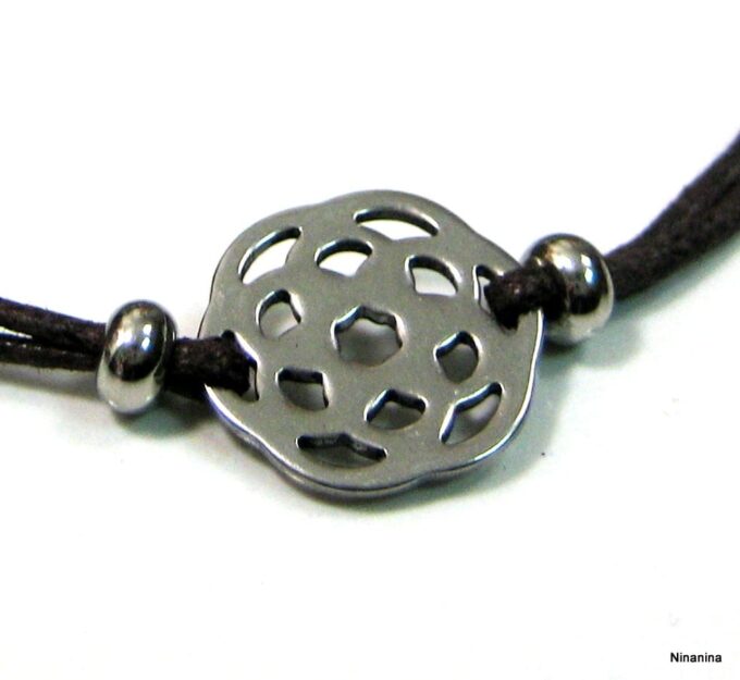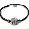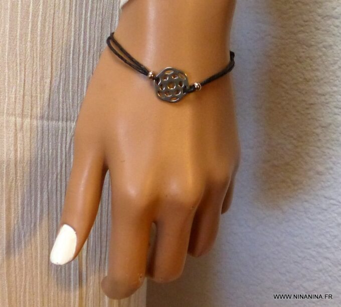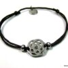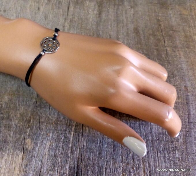 Bracelet femme cordon fleur acier inoxydable composé d’une fleur ronde et deux petites perles en acier inoxydable filigrané montée sur un cordon de coton ciré noir (1 mm de diamètre).