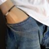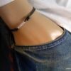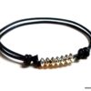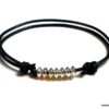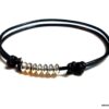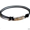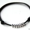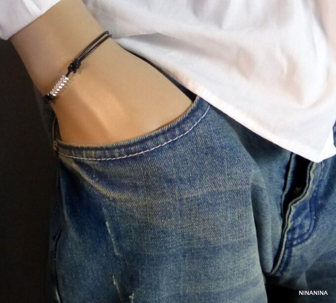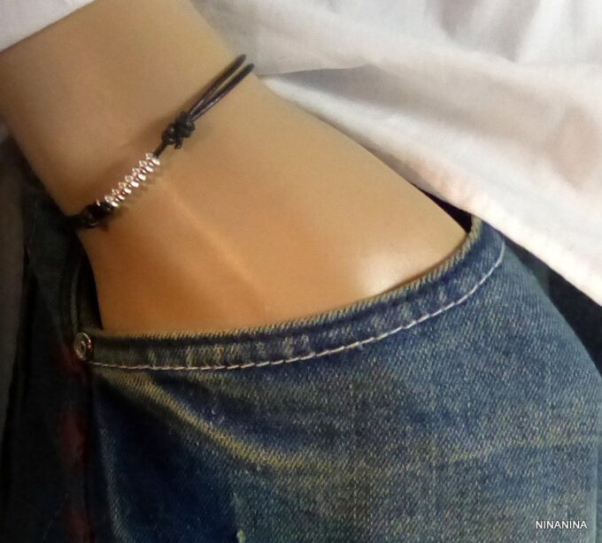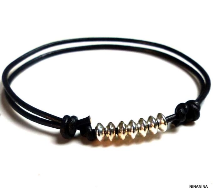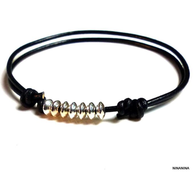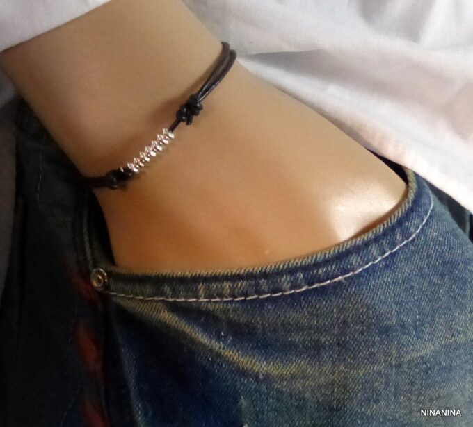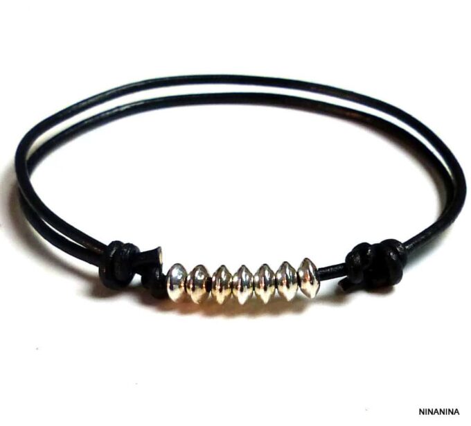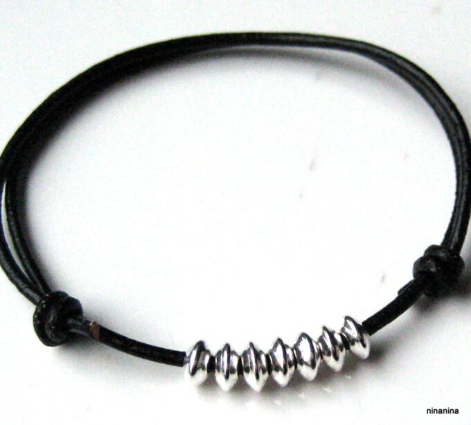 Bracelet cordon fil cuir perles argent massif composé de 7 perles plates en argent 925 montées sur un double cordon de cuir noir (1,5 mm de diamètre).