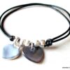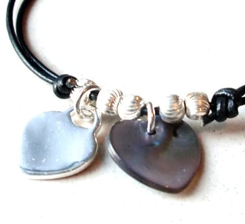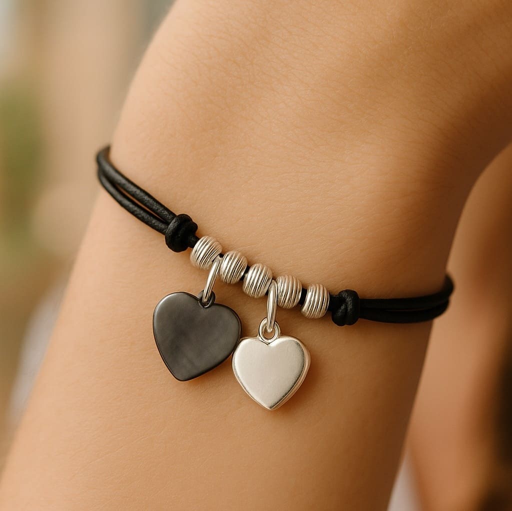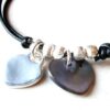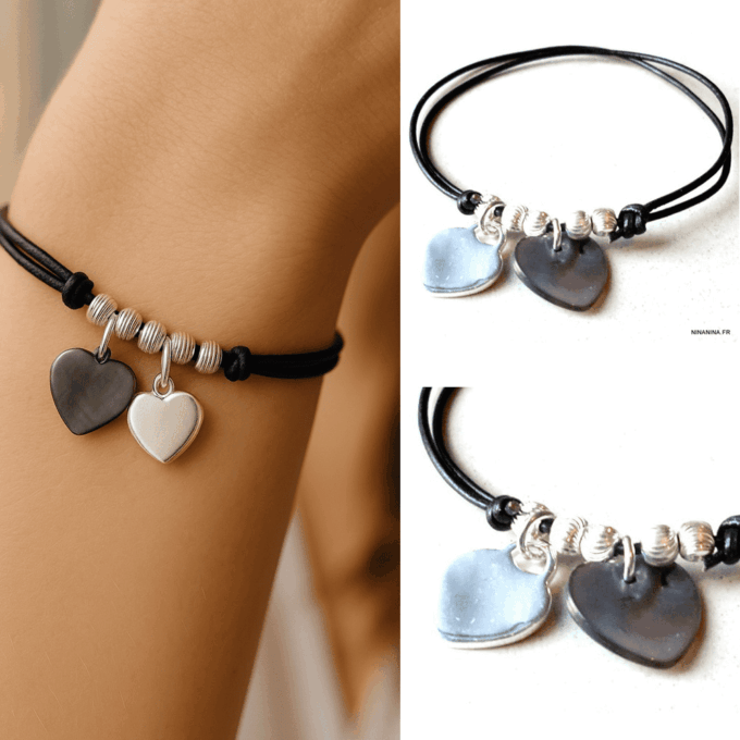 Ce bracelet artisanal élégant se compose d’un cordon en cuir noir orné de perles en argent 925 finement travaillées et de deux pendentifs en forme de cœur, l’un en plaqué argent poli, l’autre en nacre naturelle grise.