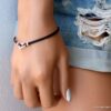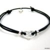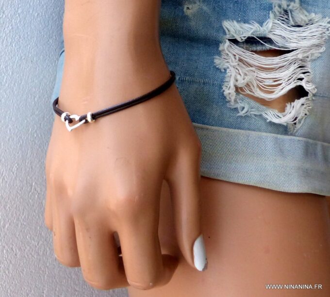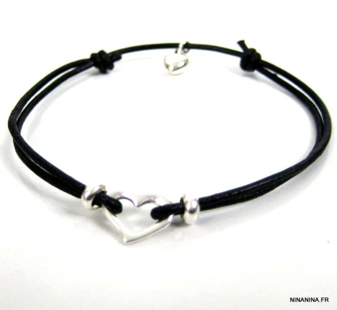 Bracelet femme cordon cuir argent massif constitué d’un coeur, de deux petites perles (3mm) et une breloque coeur en argent 925 montées sur un cordon en cuir véritable (1,5mm d’epaisseur).