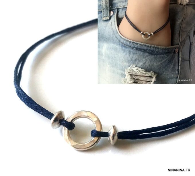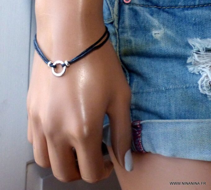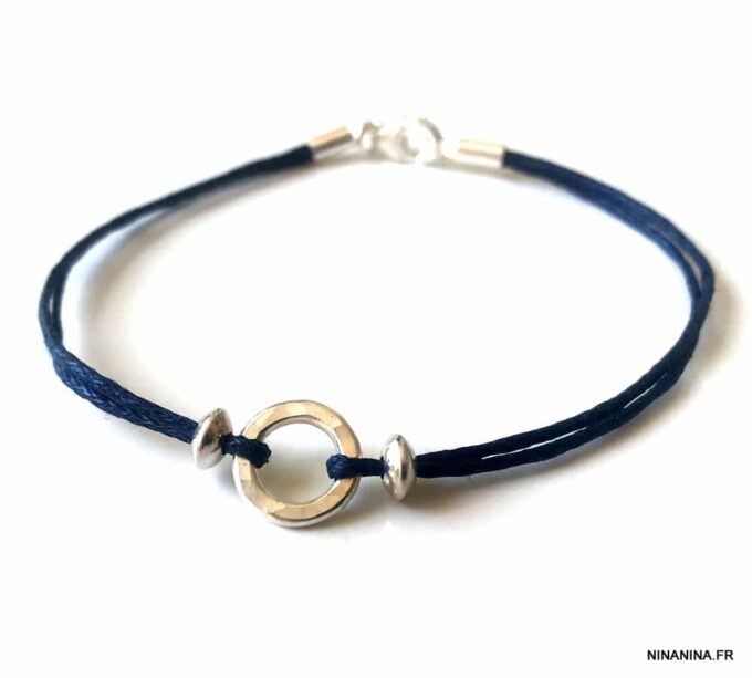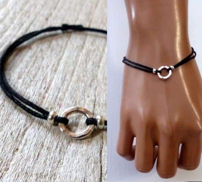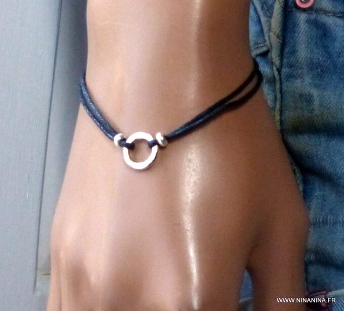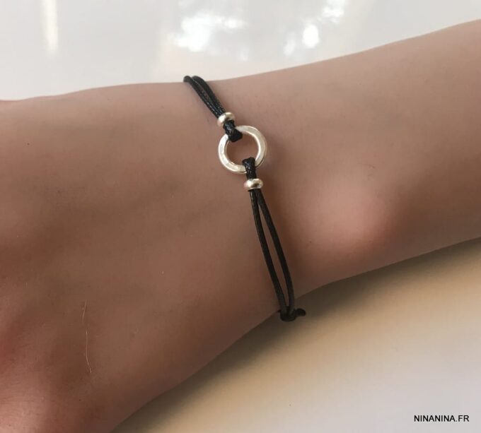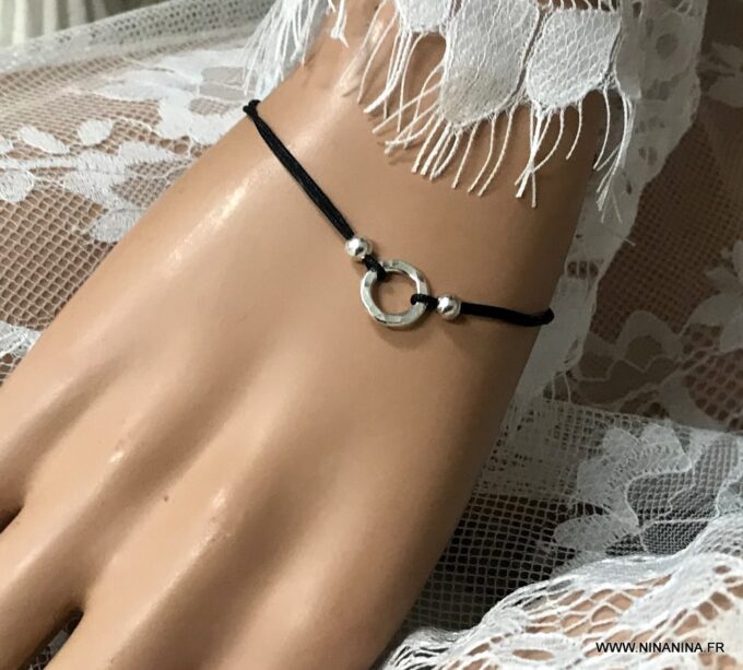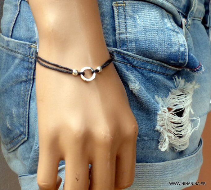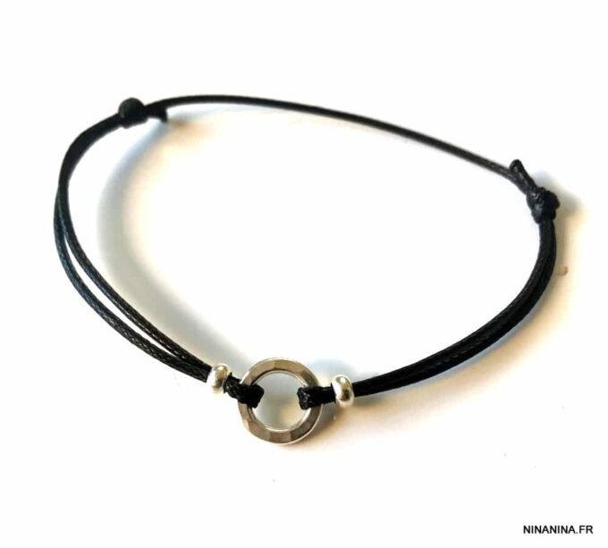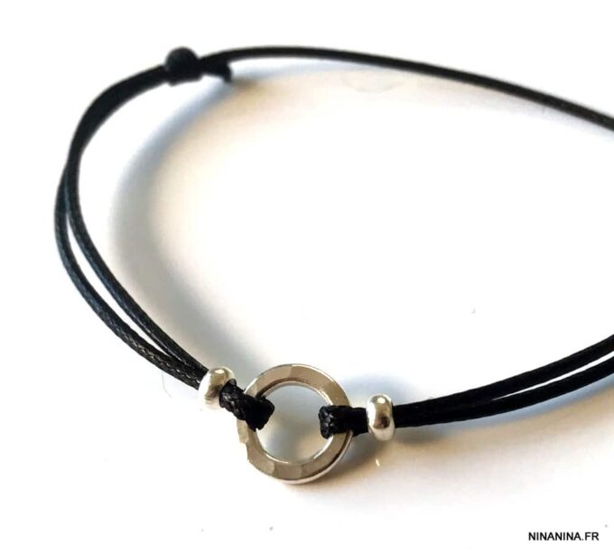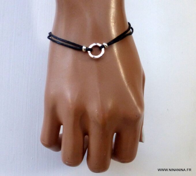 Bracelet mixte très fashion qui enlace le poignet de sa fine lanière de coton ciré noir, ce Bracelet cordon femme luxe anneau argent martelé est composé de deux perles en argent 925 et d’un anneau rond en argent 925 martelé monté sur un cordon en coton ciré noir de 1 mm de diamètre à liens coulissants. Ce Bracelet cordon femme chic est proposé à un prix mini et existe en plusieurs couleurs : noir, marron foncé, rouge, bleu ciel et naturel à choisir dans le menu déroulant.
