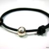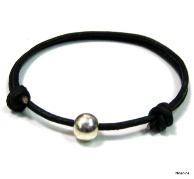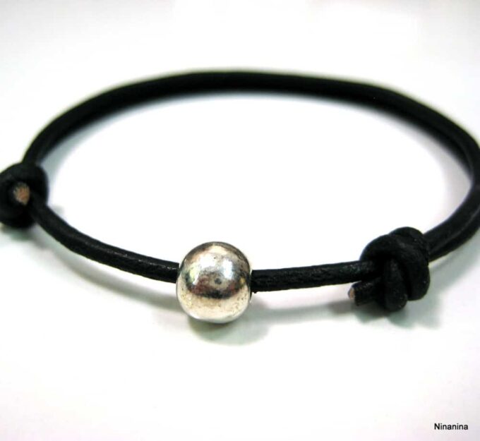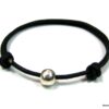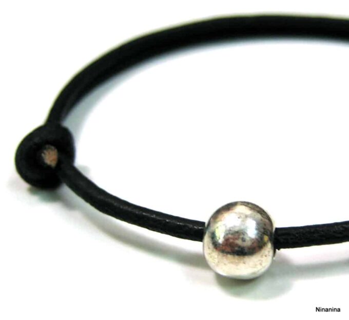 Bracelet lacet cuir homme ou femme perle Argent composé d’une perle en argent 925 montée sur un cordon en cuir véritable (2mm d’epaisseur). Diamètre de la perle : 0,8 cm. Existe en noir, naturel, marron chocolat, rouge et gris. Diamètre : 5 cm env réglable par liens coulissants. Livré dans sa pochette d’organza